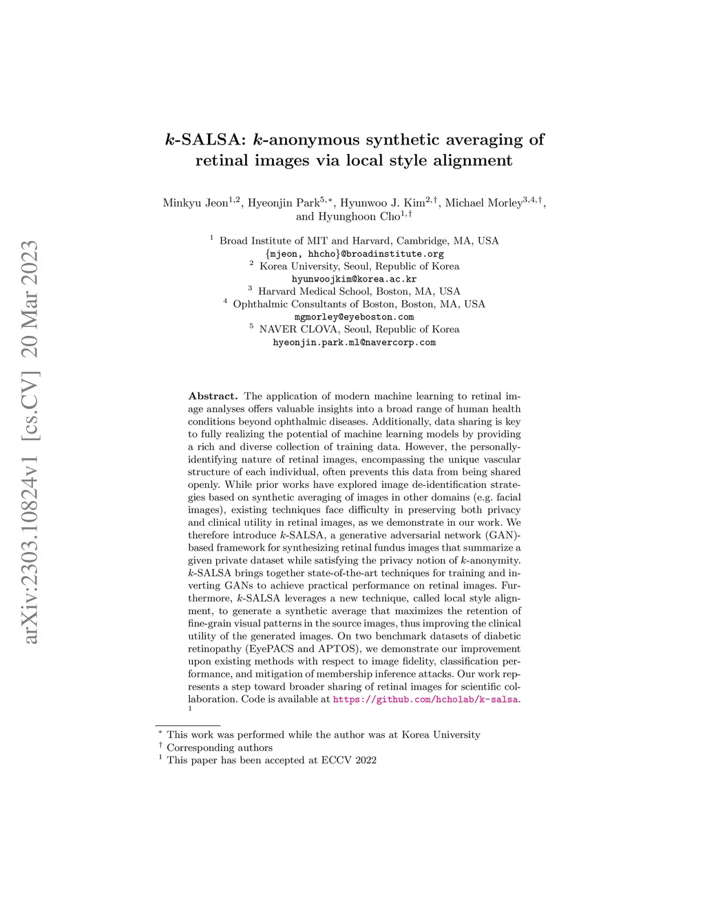 k-SALSA: k-anonymous synthetic averaging of retinal images via local