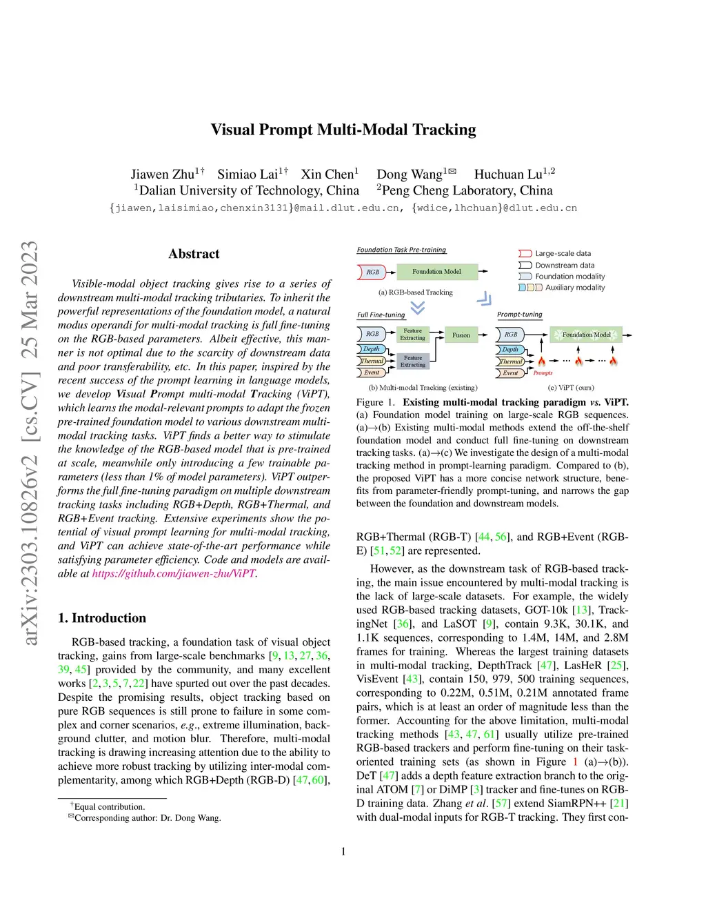 Visible-modal object tracking gives rise to a series of downstream multi-modal tracking tributaries. To inherit the powerful representations of the foundation model, a natural modus operandi for multi-modal tracking is full fine-tuning on the RGB-based parameters. Albeit effective, this manner is not optimal due to the scarcity of downstream data and poor transferability, etc. In this paper, inspired by the recent success of the prompt learning in language models, we develop Visual Prompt multi-modal Tracking (ViPT), which learns the modal-relevant prompts to adapt the frozen pre-trained foundation model to various downstream multimodal tracking tasks. ViPT finds a better way to stimulate the knowledge of the RGB-based model that is pre-trained at scale, meanwhile only introducing a few trainable parameters (less than 1% of model parameters). ViPT outperforms the full fine-tuning paradigm on multiple downstream tracking tasks including RGB+Depth, RGB+Thermal, and RGB+Event tracking. Extensive experiments show the potential of visual prompt learning for multi-modal tracking, and ViPT can achieve state-of-the-art performance while satisfying parameter efficiency. Code and models are available at https://github.com/jiawen-zhu/ViPT.
