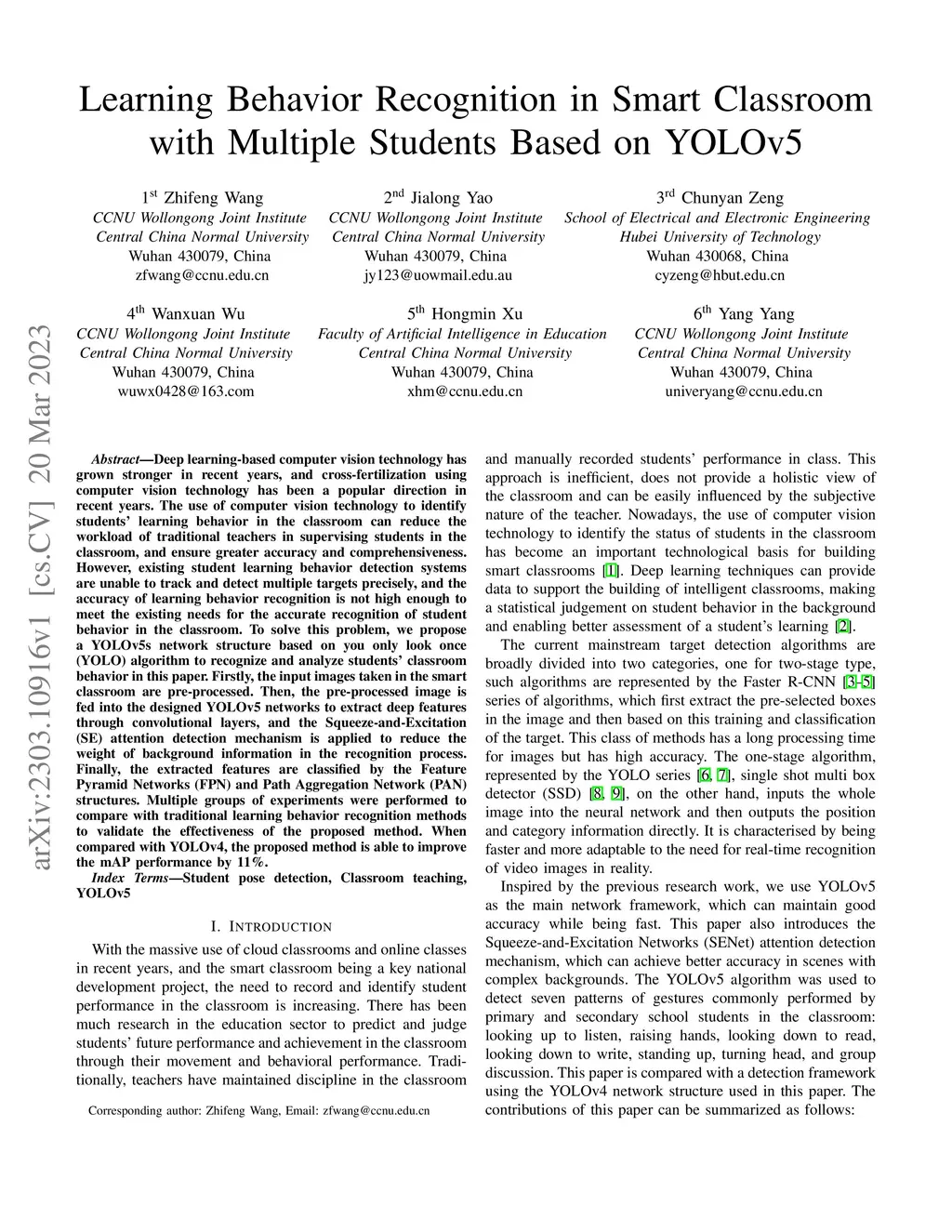 Deep learning-based computer vision technology has grown stronger in recent years, and cross-fertilization using computer vision technology has been a popular direction in recent years. The use of computer vision technology to identify students' learning behavior in the classroom can reduce the workload of traditional teachers in supervising students in the classroom, and ensure greater accuracy and comprehensiveness. However, existing student learning behavior detection systems are unable to track and detect multiple targets precisely, and the accuracy of learning behavior recognition is not high enough to meet the existing needs for the accurate recognition of student behavior in the classroom. To solve this problem, we propose a YOLOv5s network structure based on you only look once (YOLO) algorithm to recognize and analyze students' classroom behavior in this paper. Firstly, the input images taken in the smart classroom are pre-processed. Then, the pre-processed image is fed into the designed YOLOv5 networks to extract deep features through convolutional layers, and the Squeeze-and-Excitation (SE) attention detection mechanism is applied to reduce the weight of background information in the recognition process. Finally, the extracted features are classified by the Feature Pyramid Networks (FPN) and Path Aggregation Network (PAN) structures. Multiple groups of experiments were performed to compare with traditional learning behavior recognition methods to validate the effectiveness of the proposed method. When compared with YOLOv4, the proposed method is able to improve the mAP performance by 11%.
