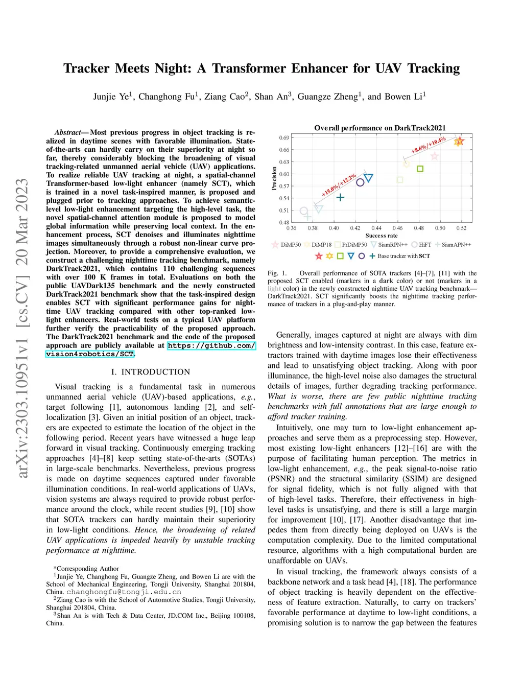 Most previous progress in object tracking is realized in daytime scenes with favorable illumination. State-of-the-arts can hardly carry on their superiority at night so far, thereby considerably blocking the broadening of visual tracking-related unmanned aerial vehicle (UAV) applications. To realize reliable UAV tracking at night, a spatial-channel Transformer-based low-light enhancer (namely SCT), which is trained in a novel task-inspired manner, is proposed and plugged prior to tracking approaches. To achieve semantic-level low-light enhancement targeting the high-level task, the novel spatial-channel attention module is proposed to model global information while preserving local context. In the enhancement process, SCT denoises and illuminates nighttime images simultaneously through a robust non-linear curve projection. Moreover, to provide a comprehensive evaluation, we construct a challenging nighttime tracking benchmark, namely DarkTrack2021, which contains 110 challenging sequences with over 100 K frames in total. Evaluations on both the public UAVDark135 benchmark and the newly constructed DarkTrack2021 benchmark show that the task-inspired design enables SCT with significant performance gains for nighttime UAV tracking compared with other top-ranked low-light enhancers. Real-world tests on a typical UAV platform further verify the practicability of the proposed approach. The DarkTrack2021 benchmark and the code of the proposed approach are publicly available at https://github.com/vision4robotics/SCT.