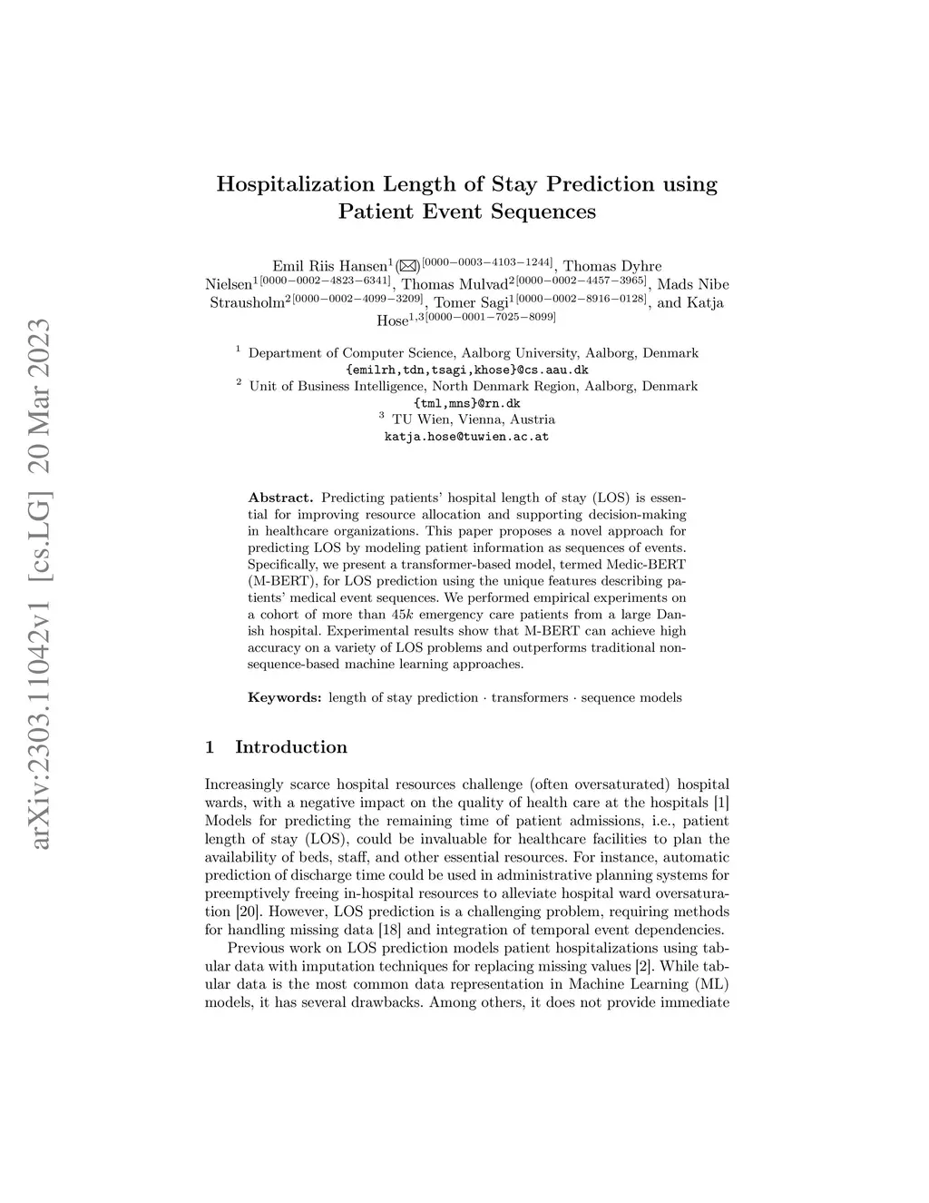 Predicting patients hospital length of stay (LOS) is essential for improving resource allocation and supporting decision-making in healthcare organizations. This paper proposes a novel approach for predicting LOS by modeling patient information as sequences of events. Specifically, we present a transformer-based model, termed Medic-BERT (M-BERT), for LOS prediction using the unique features describing patients medical event sequences. We performed empirical experiments on a cohort of more than 45k emergency care patients from a large Danish hospital. Experimental results show that M-BERT can achieve high accuracy on a variety of LOS problems and outperforms traditional nonsequence-based machine learning approaches.
