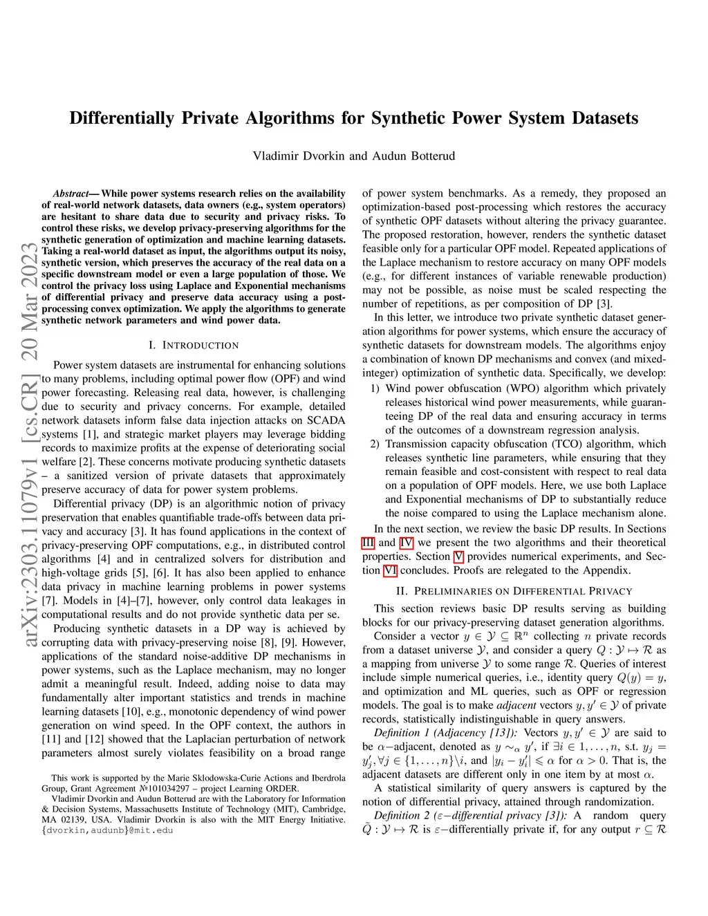 While power systems research relies on the availability of real-world network datasets, data owners (e.g., system operators) are hesitant to share data due to security and privacy risks. To control these risks, we develop privacy-preserving algorithms for the synthetic generation of optimization and machine learning datasets. Taking a real-world dataset as input, the algorithms output its noisy, synthetic version, which preserves the accuracy of the real data on a specific downstream model or even a large population of those. We control the privacy loss using Laplace and Exponential mechanisms of differential privacy and preserve data accuracy using a post-processing convex optimization. We apply the algorithms to generate synthetic network parameters and wind power data.