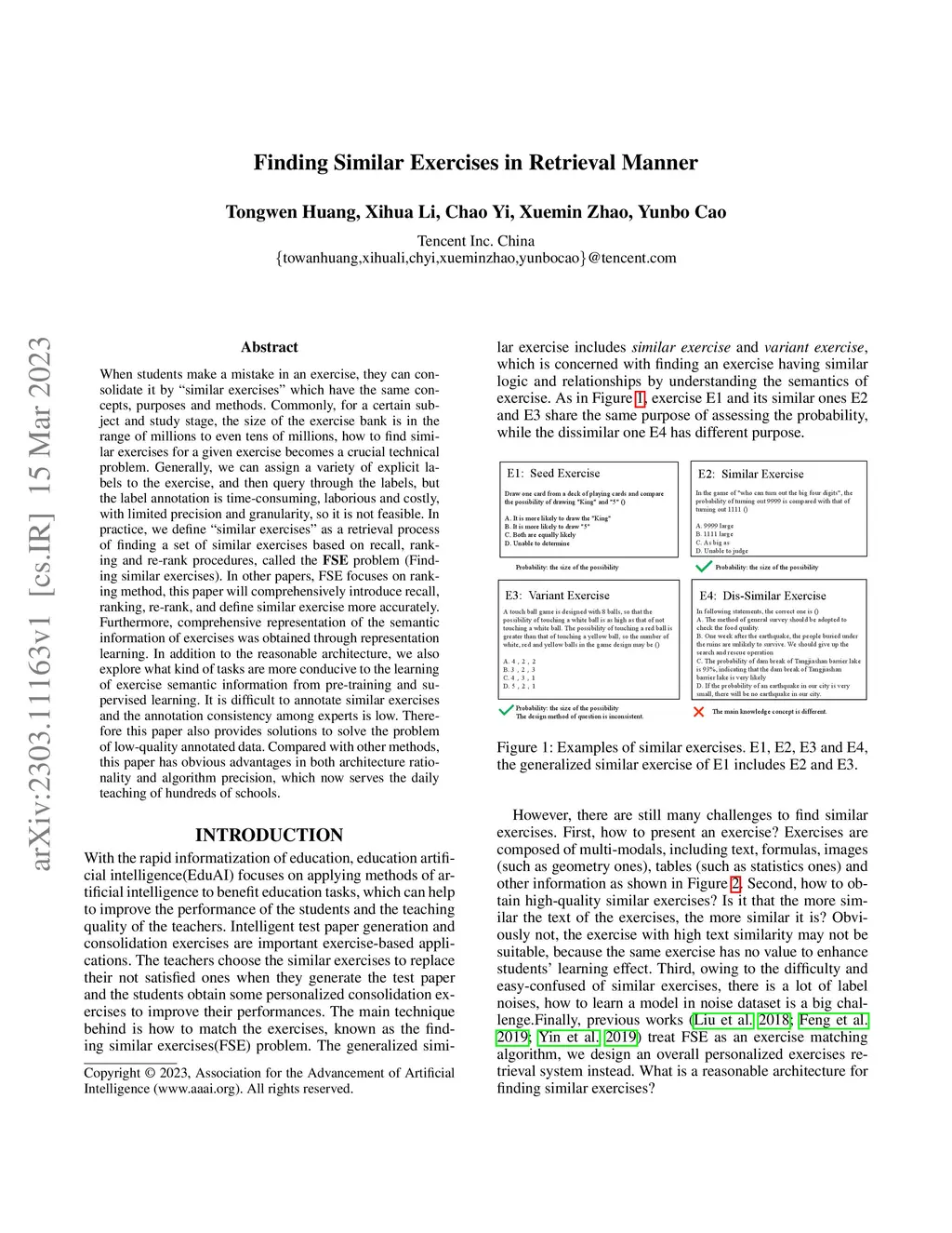 When students make a mistake in an exercise, they can consolidate it by ``similar exercises'' which have the same concepts, purposes and methods. Commonly, for a certain subject and study stage, the size of the exercise bank is in the range of millions to even tens of millions, how to find similar exercises for a given exercise becomes a crucial technical problem. Generally, we can assign a variety of explicit labels to the exercise, and then query through the labels, but the label annotation is time-consuming, laborious and costly, with limited precision and granularity, so it is not feasible. In practice, we define ``similar exercises'' as a retrieval process of finding a set of similar exercises based on recall, ranking and re-rank procedures, called the \textbf{FSE} problem (Finding similar exercises). Furthermore, comprehensive representation of the semantic information of exercises was obtained through representation learning. In addition to the reasonable architecture, we also explore what kind of tasks are more conducive to the learning of exercise semantic information from pre-training and supervised learning. It is difficult to annotate similar exercises and the annotation consistency among experts is low. Therefore this paper also provides solutions to solve the problem of low-quality annotated data. Compared with other methods, this paper has obvious advantages in both architecture rationality and algorithm precision, which now serves the daily teaching of hundreds of schools.