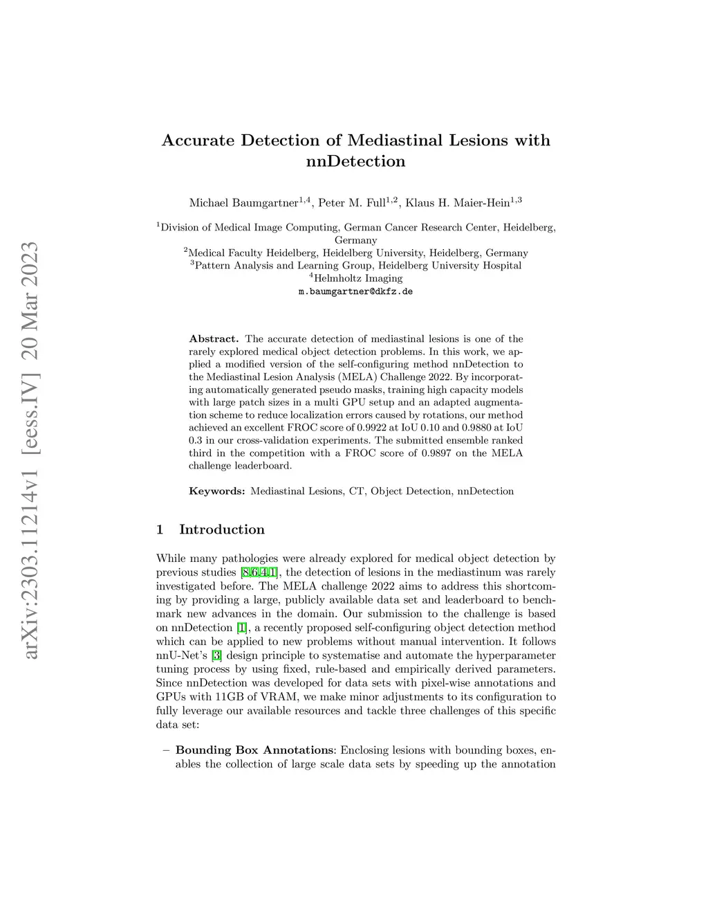 The accurate detection of mediastinal lesions is one of the rarely explored medical object detection problems. In this work, we applied a modified version of the self-configuring method nnDetection to the Mediastinal Lesion Analysis (MELA) Challenge 2022. By incorporating automatically generated pseudo masks, training high capacity models with large patch sizes in a multi GPU setup and an adapted augmentation scheme to reduce localization errors caused by rotations, our method achieved an excellent FROC score of 0.9922 at IoU 0.10 and 0.9880 at IoU 0.3 in our cross-validation experiments. The submitted ensemble ranked third in the competition with a FROC score of 0.9897 on the MELA challenge leaderboard.