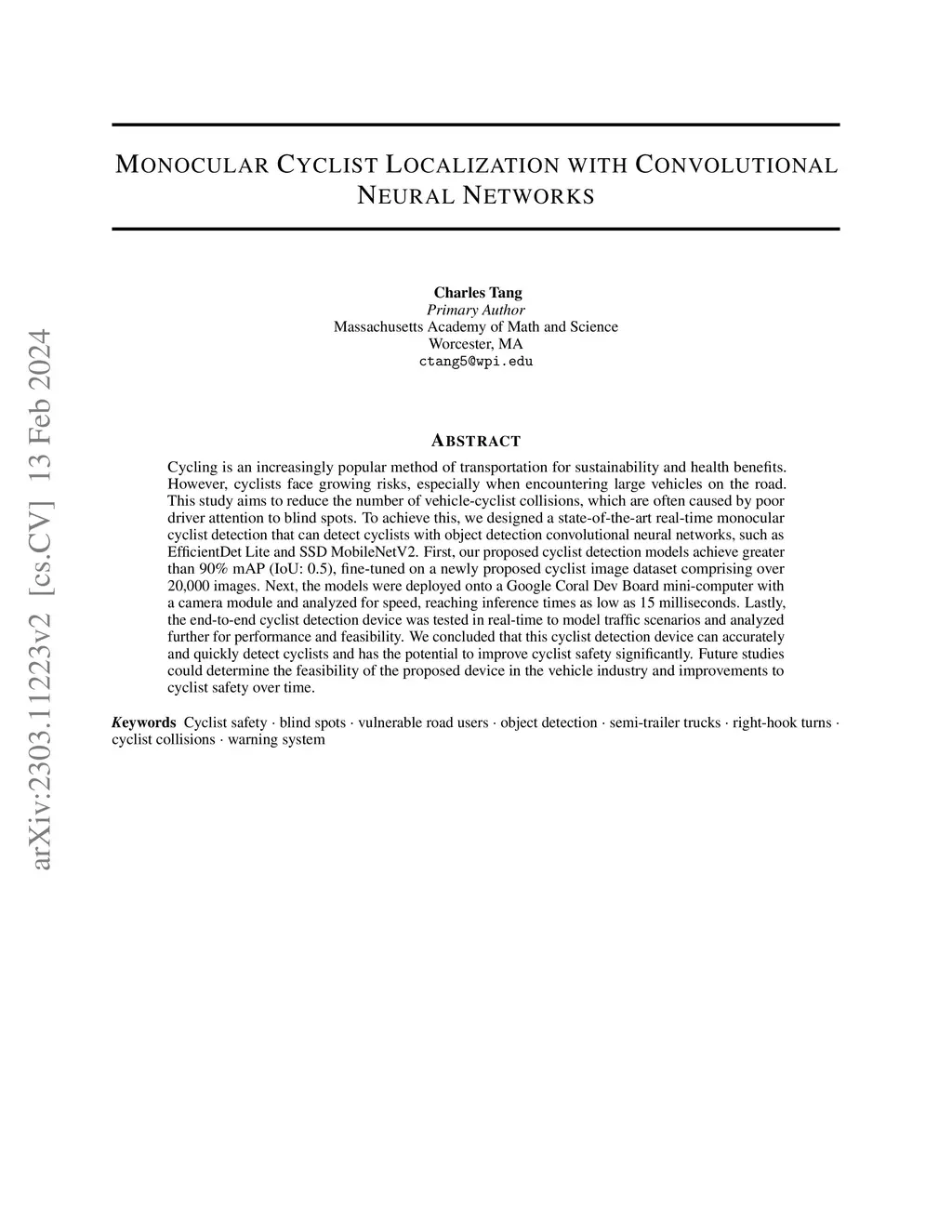 Cycling is an increasingly popular method of transportation for sustainability and health benefits. However, cyclists face growing risks, especially when encountering large vehicles on the road. This study aims to reduce the number of vehicle-cyclist collisions, which are often caused by poor driver attention to blind spots. To achieve this, we designed a state-of-the-art real-time monocular cyclist detection that can detect cyclists with object detection convolutional neural networks, such as EfficientDet Lite and SSD MobileNetV2. First, our proposed cyclist detection models achieve greater than 0.900 mAP (IoU: 0.5), fine-tuned on a newly proposed cyclist image dataset comprising over 20,000 images. Next, the models were deployed onto a Google Coral Dev Board mini-computer with a camera module and analyzed for speed, reaching inference times as low as 15 milliseconds. Lastly, the end-to-end cyclist detection device was tested in real-time to model traffic scenarios and analyzed further for performance and feasibility. We concluded that this cyclist detection device can accurately and quickly detect cyclists and has the potential to improve cyclist safety significantly. Future studies could determine the feasibility of the proposed device in the vehicle industry and improvements to cyclist safety over time.