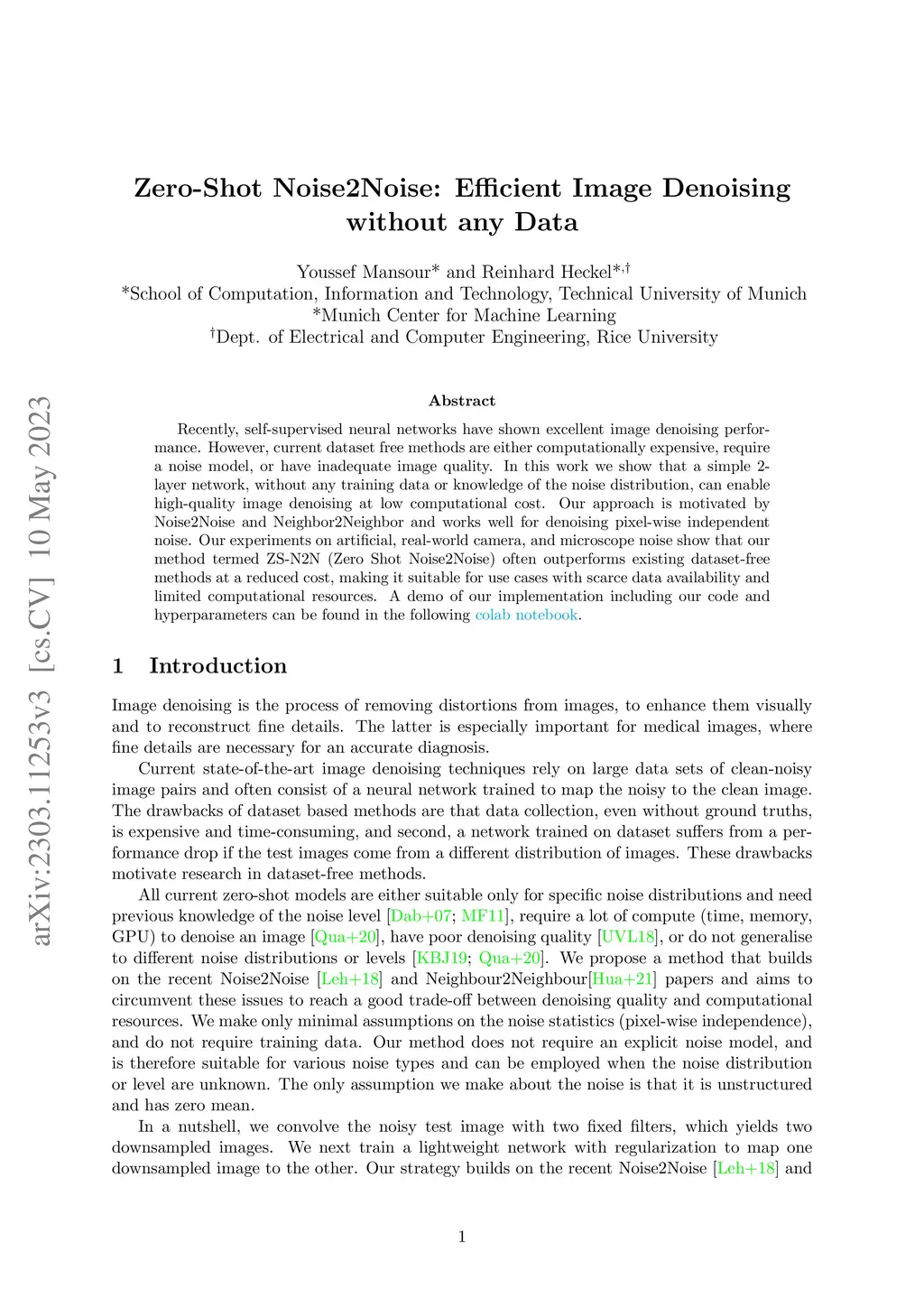 Recently, self-supervised neural networks have shown excellent image denoising performance. However, current dataset free methods are either computationally expensive, require a noise model, or have inadequate image quality. In this work we show that a simple 2-layer network, without any training data or knowledge of the noise distribution, can enable high-quality image denoising at low computational cost. Our approach is motivated by Noise2Noise and Neighbor2Neighbor and works well for denoising pixel-wise independent noise. Our experiments on artificial, real-world camera, and microscope noise show that our method termed ZS-N2N (Zero Shot Noise2Noise) often outperforms existing dataset-free methods at a reduced cost, making it suitable for use cases with scarce data availability and limited computational resources. A demo of our implementation including our code and hyperparameters can be found in the following colab notebook: https://colab.research.google.com/drive/1i82nyizTdszyHkaHBuKPbWnTzao8HF9b