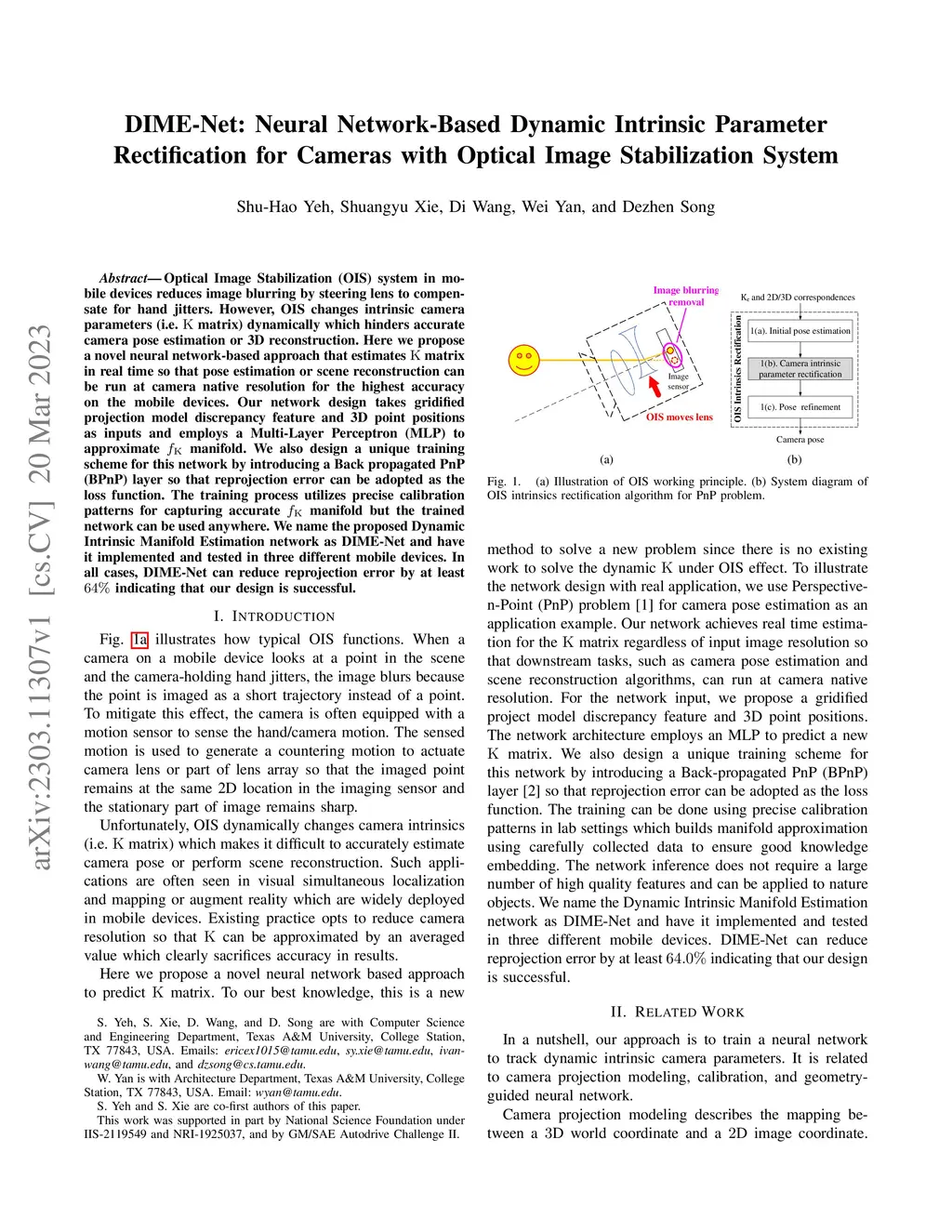 Optical Image Stabilization (OIS) system in mobile devices reduces image blurring by steering lens to compensate for hand jitters. However, OIS changes intrinsic camera parameters (i.e. matrix) dynamically which hinders accurate camera pose estimation or 3D reconstruction. Here we propose a novel neural network-based approach that estimates matrix in real-time so that pose estimation or scene reconstruction can be run at camera native resolution for the highest accuracy on mobile devices. Our network design takes gratified projection model discrepancy feature and 3D point positions as inputs and employs a Multi-Layer Perceptron (MLP) to approximate manifold. We also design a unique training scheme for this network by introducing a Back propagated PnP (BPnP) layer so that reprojection error can be adopted as the loss function. The training process utilizes precise calibration patterns for capturing accurate manifold but the trained network can be used anywhere. We name the proposed Dynamic Intrinsic Manifold Estimation network as DIME-Net and have it implemented and tested on three different mobile devices. In all cases, DIME-Net can reduce reprojection error by at least indicating that our design is successful.