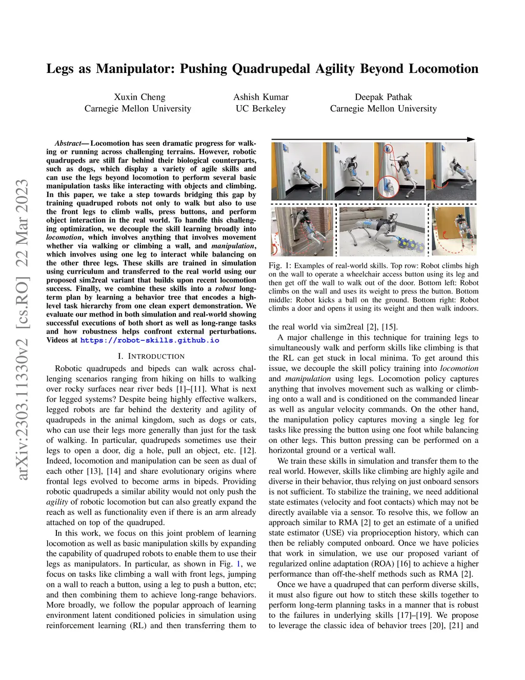 Locomotion has seen dramatic progress for walking or running across challenging terrains. However, robotic quadrupeds are still far behind their biological counterparts, such as dogs, which display a variety of agile skills and can use the legs beyond locomotion to perform several basic manipulation tasks like interacting with objects and climbing. In this paper, we take a step towards bridging this gap by training quadruped robots not only to walk but also to use the front legs to climb walls, press buttons, and perform object interaction in the real world. To handle this challenging optimization, we decouple the skill learning broadly into locomotion, which involves anything that involves movement whether via walking or climbing a wall, and manipulation, which involves using one leg to interact while balancing on the other three legs. These skills are trained in simulation using curriculum and transferred to the real world using our proposed sim2real variant that builds upon recent locomotion success. Finally, we combine these skills into a robust long-term plan by learning a behavior tree that encodes a high-level task hierarchy from one clean expert demonstration. We evaluate our method in both simulation and real-world showing successful executions of both short as well as long-range tasks and how robustness helps confront external perturbations. Videos at https://robot-skills.github.io