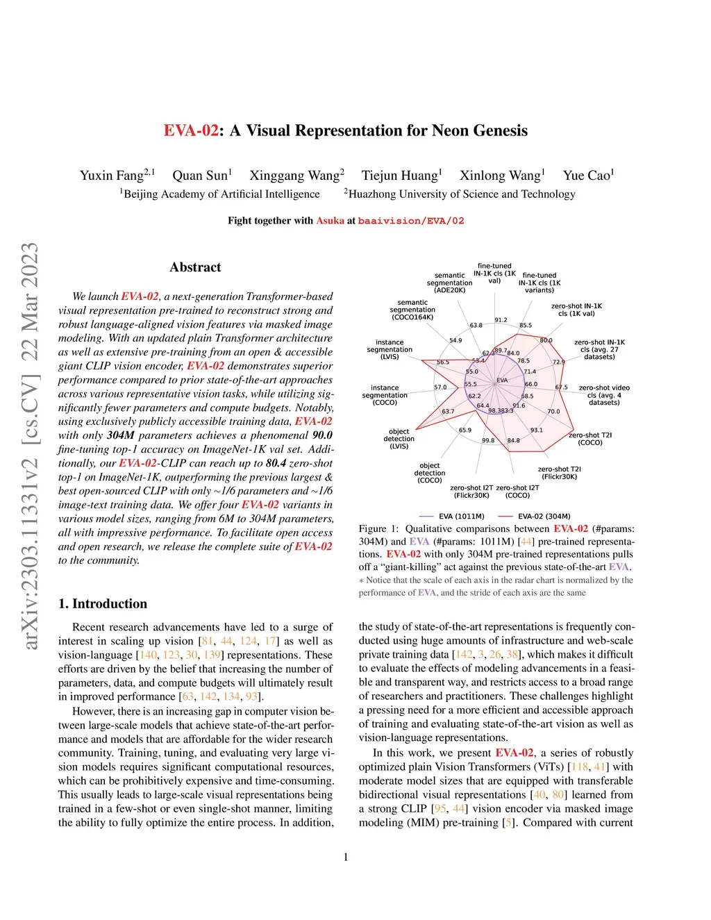 We launch EVA-02, a next-generation Transformer-based visual representation pre-trained to reconstruct strong and robust language-aligned vision features via masked image modeling. With an updated plain Transformer architecture as well as extensive pre-training from an open & accessible giant CLIP vision encoder, EVA-02 demonstrates superior performance compared to prior state-of-the-art approaches across various representative vision tasks, while utilizing significantly fewer parameters and compute budgets. Notably, using exclusively publicly accessible training data, EVA-02 with only 304M parameters achieves a phenomenal 90.0 fine-tuning top-1 accuracy on ImageNet-1K val set. Additionally, our EVA-02-CLIP can reach up to 80.4 zero-shot top-1 on ImageNet-1K, outperforming the previous largest & best open-sourced CLIP with only ~1/6 parameters and ~1/6 image-text training data. We offer four EVA-02 variants in various model sizes, ranging from 6M to 304M parameters, all with impressive performance. To facilitate open access and open research, we release the complete suite of EVA-02 to the community at https://github.com/baaivision/EVA/tree/master/EVA-02.