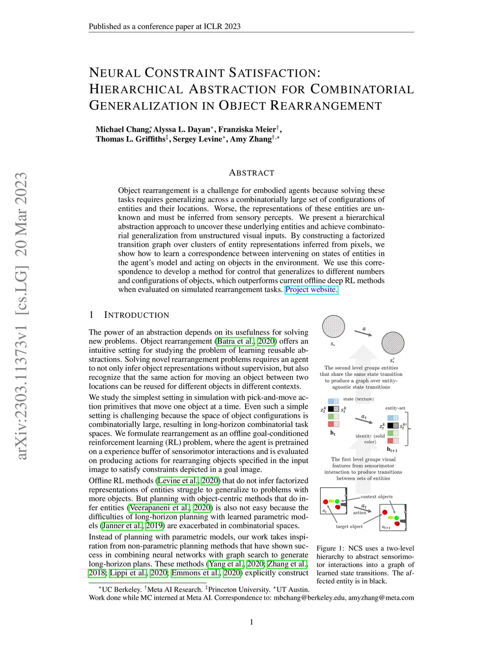 Object rearrangement is a challenge for embodied agents because solving these tasks requires generalizing across a combinatorially large set of configurations of entities and their locations. Worse, the representations of these entities are unknown and must be inferred from sensory percepts. We present a hierarchical abstraction approach to uncover these underlying entities and achieve combinatorial generalization from unstructured visual inputs. By constructing a factorized transition graph over clusters of entity representations inferred from pixels, we show how to learn a correspondence between intervening on states of entities in the agent's model and acting on objects in the environment. We use this correspondence to develop a method for control that generalizes to different numbers and configurations of objects, which outperforms current offline deep RL methods when evaluated on simulated rearrangement tasks.