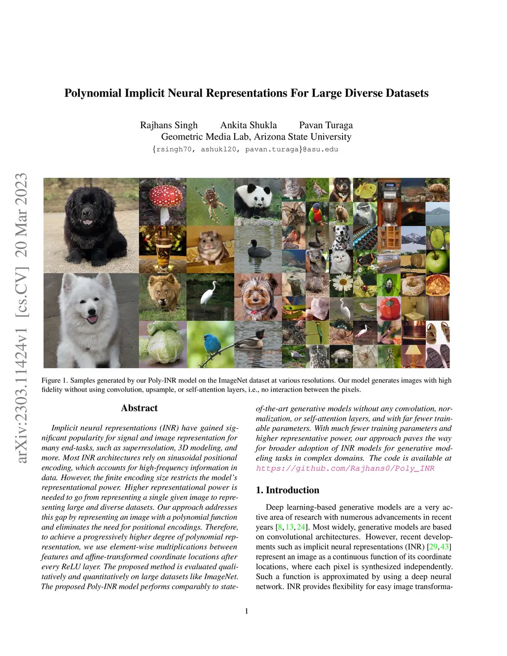 Implicit neural representations (INR) have gained significant popularity for signal and image representation for many end-tasks, such as superresolution, 3D modeling, and more. Most INR architectures rely on sinusoidal positional encoding, which accounts for high-frequency information in data. However, the finite encoding size restricts the model's representational power. Higher representational power is needed to go from representing a single given image to representing large and diverse datasets. Our approach addresses this gap by representing an image with a polynomial function and eliminates the need for positional encodings. Therefore, to achieve a progressively higher degree of polynomial representation, we use element-wise multiplications between features and affine-transformed coordinate locations after every ReLU layer. The proposed method is evaluated qualitatively and quantitatively on large datasets like ImageNet. The proposed Poly-INR model performs comparably to state-of-the-art generative models without any convolution, normalization, or self-attention layers, and with far fewer trainable parameters. With much fewer training parameters and higher representative power, our approach paves the way for broader adoption of INR models for generative modeling tasks in complex domains. The code is available at \url{https://github.com/Rajhans0/Poly_INR}