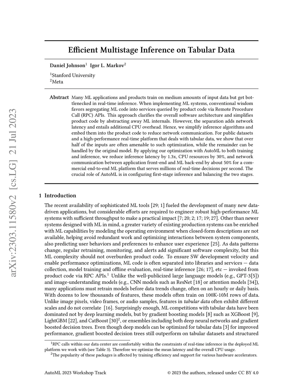 Many ML applications and products train on medium amounts of input data but get bottlenecked in real-time inference. When implementing ML systems, conventional wisdom favors segregating ML code into services queried by product code via Remote Procedure Call (RPC) APIs. This approach clarifies the overall software architecture and simplifies product code by abstracting away ML internals. However, the separation adds network latency and entails additional CPU overhead. Hence, we simplify inference algorithms and embed them into the product code to reduce network communication. For public datasets and a high-performance real-time platform that deals with tabular data, we show that over half of the inputs are often amenable to such optimization, while the remainder can be handled by the original model. By applying our optimization with AutoML to both training and inference, we reduce inference latency by 1.3x, CPU resources by 30%, and network communication between application front-end and ML back-end by about 50% for a commercial end-to-end ML platform that serves millions of real-time decisions per second.