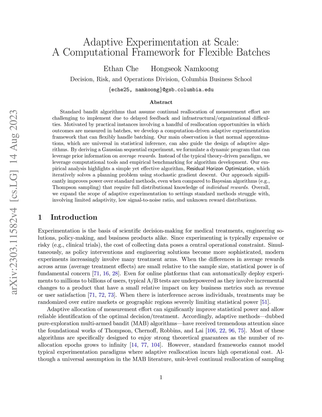 Standard bandit algorithms that assume continual reallocation of measurement effort are challenging to implement due to delayed feedback and infrastructural/organizational difficulties. Motivated by practical instances involving a handful of reallocation epochs in which outcomes are measured in batches, we develop a computation-driven adaptive experimentation framework that can flexibly handle batching. Our main observation is that normal approximations, which are universal in statistical inference, can also guide the design of adaptive algorithms. By deriving a Gaussian sequential experiment, we formulate a dynamic program that can leverage prior information on average rewards. Instead of the typical theory-driven paradigm, we leverage computational tools and empirical benchmarking for algorithm development. In particular, our empirical analysis highlights a simple yet effective algorithm, Residual Horizon Optimization, which iteratively solves a planning problem using stochastic gradient descent. Our approach significantly improves statistical power over standard methods, even when compared to Bayesian bandit algorithms (e.g., Thompson sampling) that require full distributional knowledge of individual rewards. Overall, we expand the scope of adaptive experimentation to settings that are difficult for standard methods, involving limited adaptivity, low signal-to-noise ratio, and unknown reward distributions.