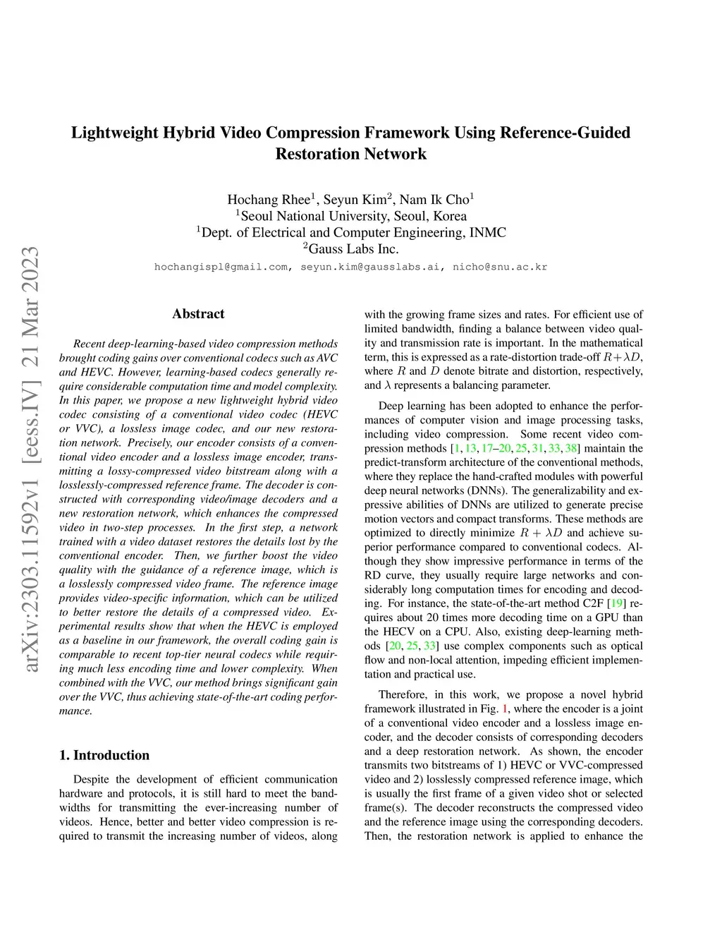 Recent deep-learning-based video compression methods brought coding gains over conventional codecs such as AVC and HEVC. However, learning-based codecs generally require considerable computation time and model complexity. In this paper, we propose a new lightweight hybrid video codec consisting of a conventional video codec(HEVC / VVC), a lossless image codec, and our new restoration network. Precisely, our encoder consists of the conventional video encoder and a lossless image encoder, transmitting a lossy-compressed video bitstream along with a losslessly-compressed reference frame. The decoder is constructed with corresponding video/image decoders and a new restoration network, which enhances the compressed video in two-step processes. In the first step, a network trained with a large video dataset restores the details lost by the conventional encoder. Then, we further boost the video quality with the guidance of a reference image, which is a losslessly compressed video frame. The reference image provides video-specific information, which can be utilized to better restore the details of a compressed video. Experimental results show that the proposed method achieves comparable performance to top-tier methods, even when applied to HEVC. Nevertheless, our method has lower complexity, a faster run time, and can be easily integrated into existing conventional codecs.