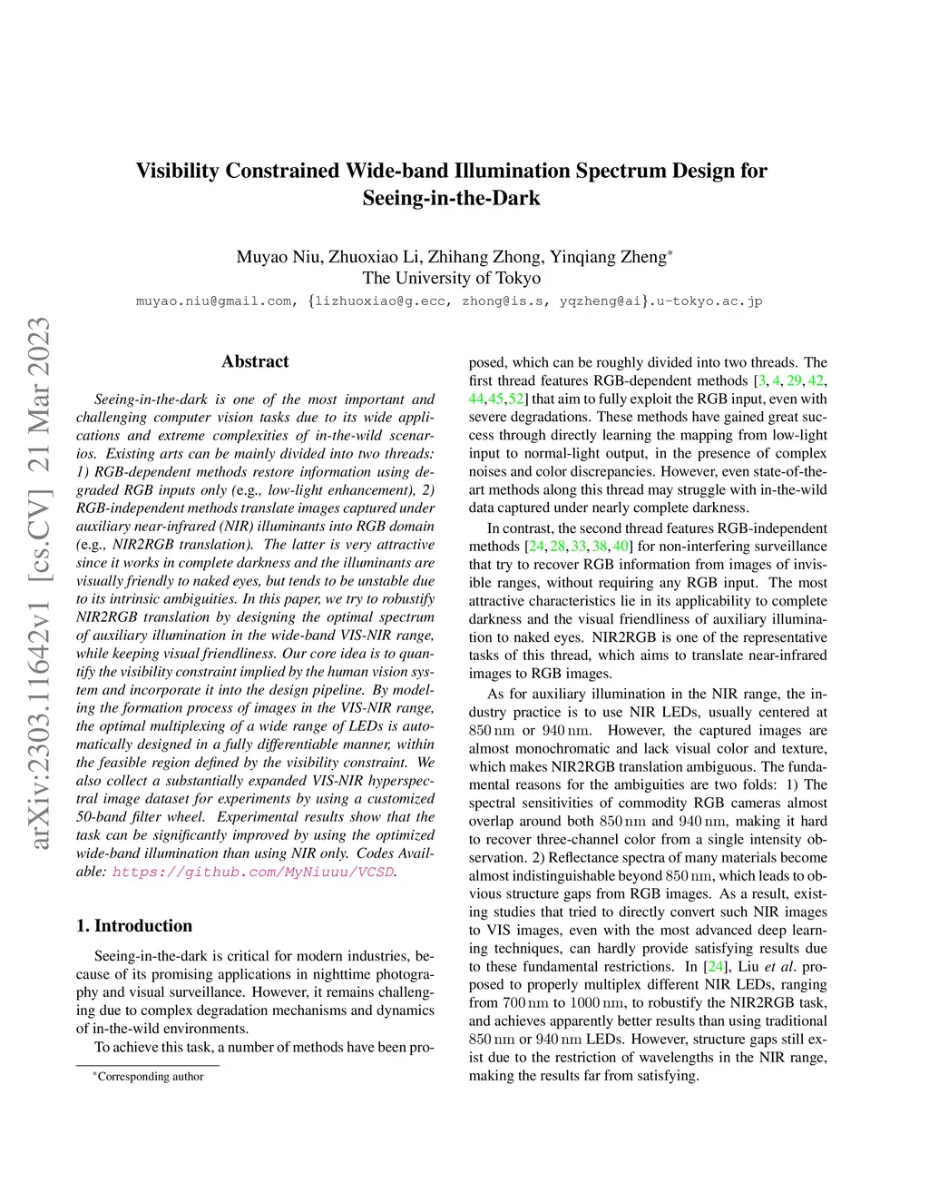 Seeing-in-the-dark is one of the most important and challenging computer vision tasks due to its wide applications and extreme complexities of in-the-wild scenarios. Existing arts can be mainly divided into two threads: 1) RGB-dependent methods restore information using degraded RGB inputs only (\eg, low-light enhancement), 2) RGB-independent methods translate images captured under auxiliary near-infrared (NIR) illuminants into RGB domain (\eg, NIR2RGB translation). The latter is very attractive since it works in complete darkness and the illuminants are visually friendly to naked eyes, but tends to be unstable due to its intrinsic ambiguities. In this paper, we try to robustify NIR2RGB translation by designing the optimal spectrum of auxiliary illumination in the wide-band VIS-NIR range, while keeping visual friendliness. Our core idea is to quantify the visibility constraint implied by the human vision system and incorporate it into the design pipeline. By modeling the formation process of images in the VIS-NIR range, the optimal multiplexing of a wide range of LEDs is automatically designed in a fully differentiable manner, within the feasible region defined by the visibility constraint. We also collect a substantially expanded VIS-NIR hyperspectral image dataset for experiments by using a customized 50-band filter wheel. Experimental results show that the task can be significantly improved by using the optimized wide-band illumination than using NIR only. Codes Available: https://github.com/MyNiuuu/VCSD.