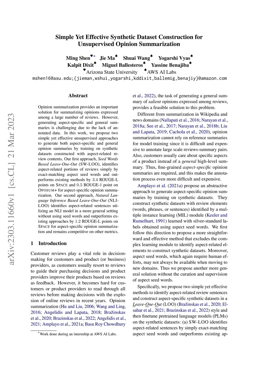 Opinion summarization provides an important solution for summarizing opinions expressed among a large number of reviews. However, generating aspect-specific and general summaries is challenging due to the lack of annotated data. In this work, we propose two simple yet effective unsupervised approaches to generate both aspect-specific and general opinion summaries by training on synthetic datasets constructed with aspect-related review contents. Our first approach, Seed Words Based Leave-One-Out (SW-LOO), identifies aspect-related portions of reviews simply by exact-matching aspect seed words and outperforms existing methods by 3.4 ROUGE-L points on SPACE and 0.5 ROUGE-1 point on OPOSUM+ for aspect-specific opinion summarization. Our second approach, Natural Language Inference Based Leave-One-Out (NLI-LOO) identifies aspect-related sentences utilizing an NLI model in a more general setting without using seed words and outperforms existing approaches by 1.2 ROUGE-L points on SPACE for aspect-specific opinion summarization and remains competitive on other metrics.