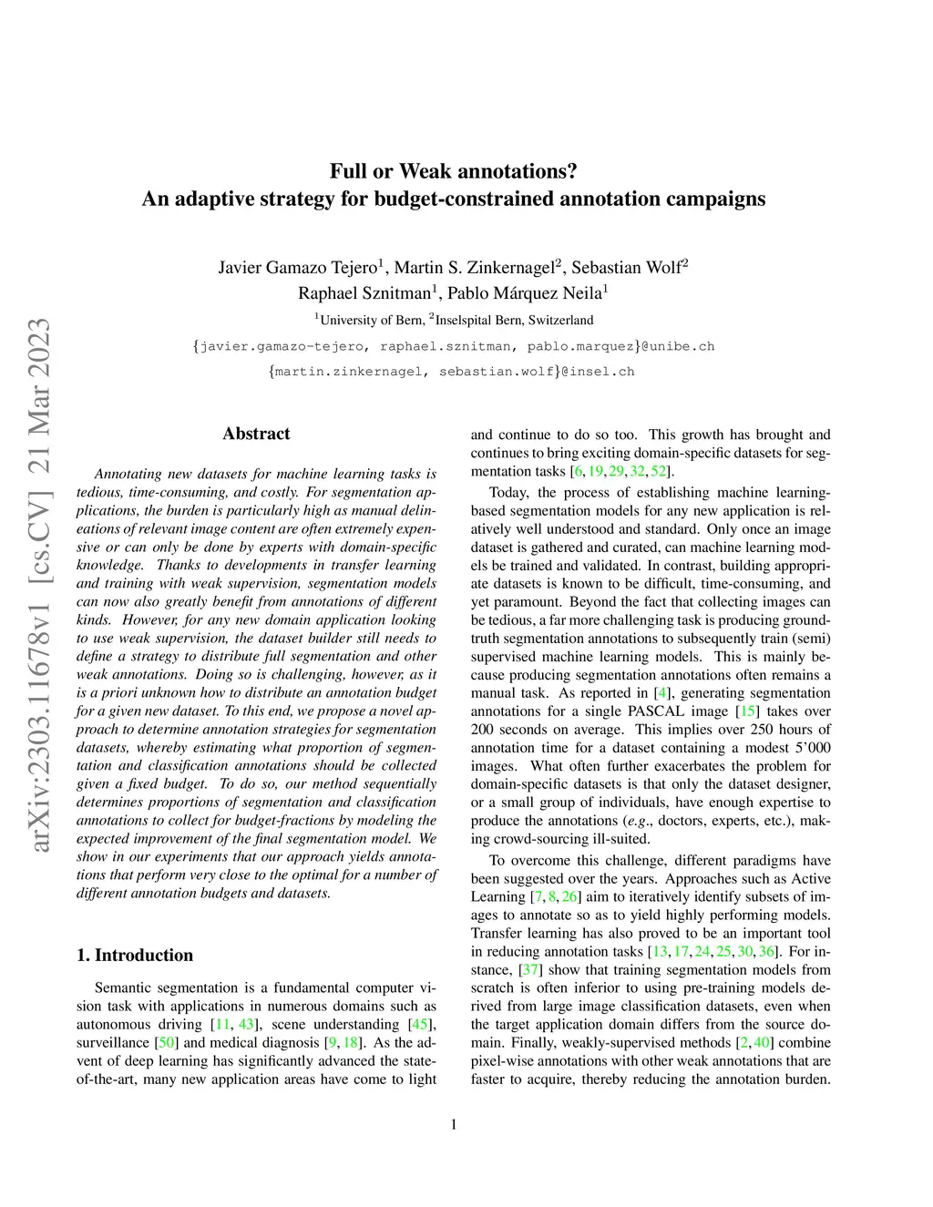 Annotating new datasets for machine learning tasks is tedious, time-consuming, and costly. For segmentation applications, the burden is particularly high as manual delineations of relevant image content are often extremely expensive or can only be done by experts with domain-specific knowledge. Thanks to developments in transfer learning and training with weak supervision, segmentation models can now also greatly benefit from annotations of different kinds. However, for any new domain application looking to use weak supervision, the dataset builder still needs to define a strategy to distribute full segmentation and other weak annotations. Doing so is challenging, however, as it is a priori unknown how to distribute an annotation budget for a given new dataset. To this end, we propose a novel approach to determine annotation strategies for segmentation datasets, whereby estimating what proportion of segmentation and classification annotations should be collected given a fixed budget. To do so, our method sequentially determines proportions of segmentation and classification annotations to collect for budget-fractions by modeling the expected improvement of the final segmentation model. We show in our experiments that our approach yields annotations that perform very close to the optimal for a number of different annotation budgets and datasets.
