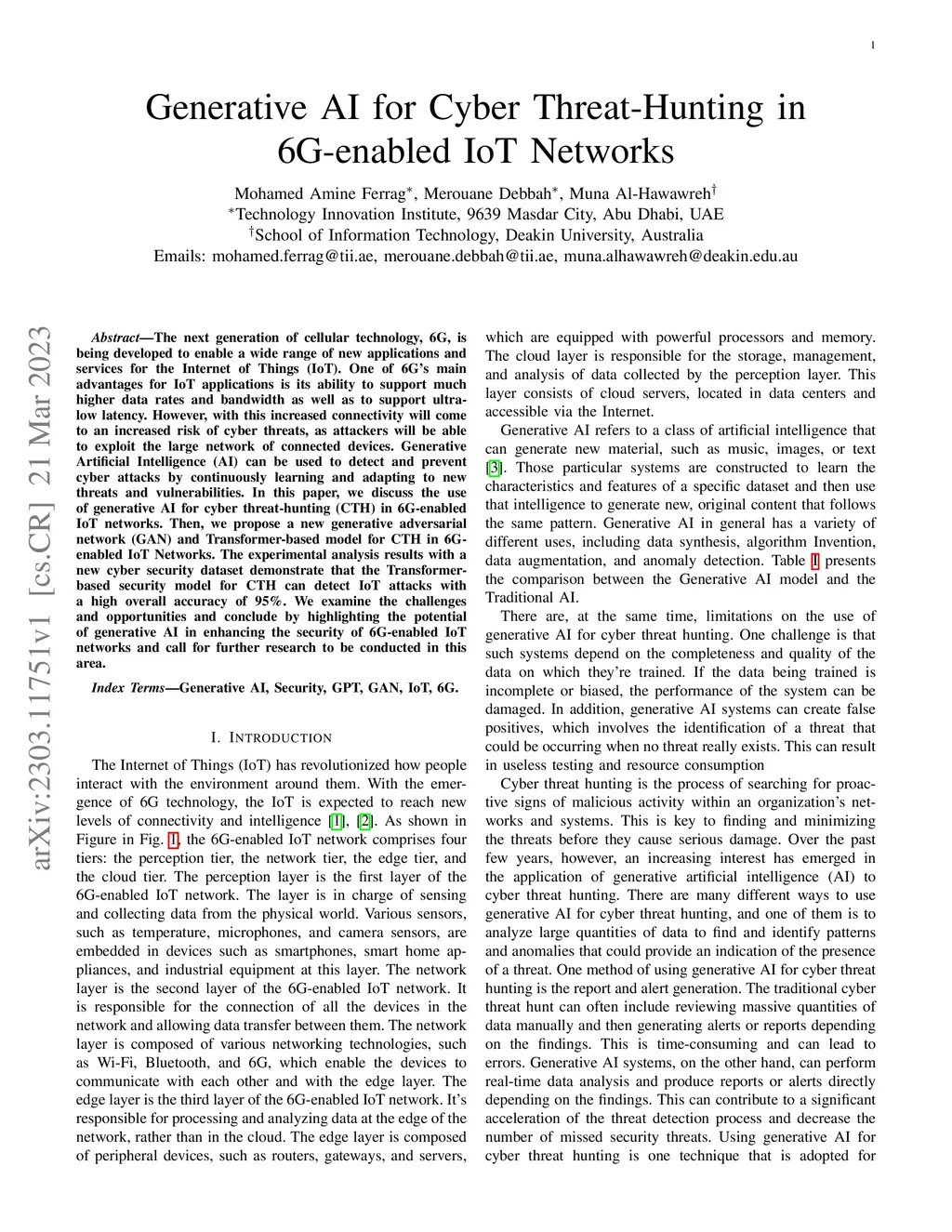 The next generation of cellular technology, 6G, is being developed to enable a wide range of new applications and services for the Internet of Things (IoT). One of 6G's main advantages for IoT applications is its ability to support much higher data rates and bandwidth as well as to support ultra-low latency. However, with this increased connectivity will come to an increased risk of cyber threats, as attackers will be able to exploit the large network of connected devices. Generative Artificial Intelligence (AI) can be used to detect and prevent cyber attacks by continuously learning and adapting to new threats and vulnerabilities. In this paper, we discuss the use of generative AI for cyber threat-hunting (CTH) in 6G-enabled IoT networks. Then, we propose a new generative adversarial network (GAN) and Transformer-based model for CTH in 6G-enabled IoT Networks. The experimental analysis results with a new cyber security dataset demonstrate that the Transformer-based security model for CTH can detect IoT attacks with a high overall accuracy of 95%. We examine the challenges and opportunities and conclude by highlighting the potential of generative AI in enhancing the security of 6G-enabled IoT networks and call for further research to be conducted in this area.