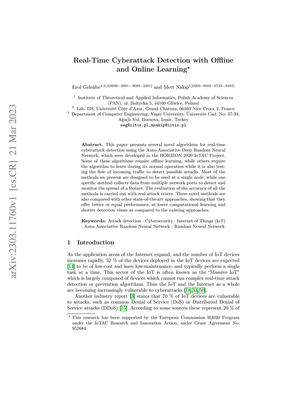 This paper presents several novel algorithms for real-time cyberattack detection using the Auto-Associative Deep Random Neural Network, which were developed in the HORIZON 2020 IoTAC Project. Some of these algorithms require offline learning, while others require the algorithm to learn during its normal operation while it is also testing the flow of incoming traffic to detect possible attacks. Most of the methods we present are designed to be used at a single node, while one specific method collects data from multiple network ports to detect and monitor the spread of a Botnet. The evaluation of the accuracy of all the methods is carried out with real attack traces. These novel methods are also compared with other state-of-the-art approaches, showing that they offer better or equal performance, at lower computational learning and shorter detection times as compared to the existing approaches.