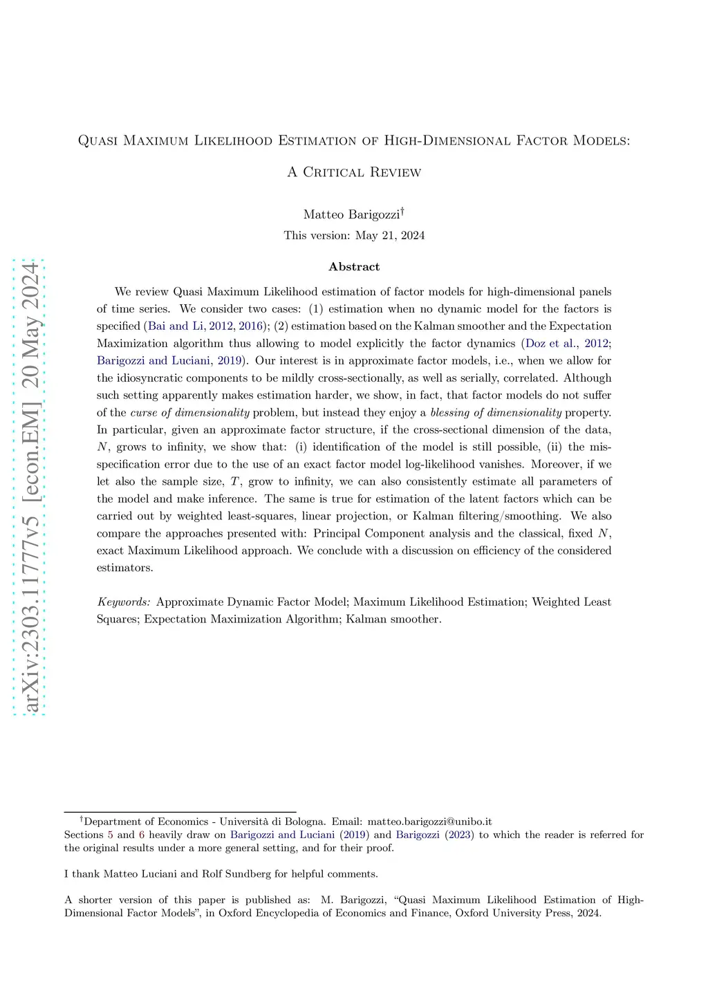 We review Quasi Maximum Likelihood estimation of factor models for high-dimensional panels of time series. We consider two cases: (1) estimation when no dynamic model for the factors is specified (Bai and Li, 2012, 2016); (2) estimation based on the Kalman smoother and the Expectation Maximization algorithm thus allowing to model explicitly the factor dynamics (Doz et al., 2012, Barigozzi and Luciani, 2019). Our interest is in approximate factor models, i.e., when we allow for the idiosyncratic components to be mildly cross-sectionally, as well as serially, correlated. Although such setting apparently makes estimation harder, we show, in fact, that factor models do not suffer of the {\it curse of dimensionality} problem, but instead they enjoy a {\it blessing of dimensionality} property. In particular, given an approximate factor structure, if the cross-sectional dimension of the data, , grows to infinity, we show that: (i) identification of the model is still possible, (ii) the mis-specification error due to the use of an exact factor model log-likelihood vanishes. Moreover, if we let also the sample size, , grow to infinity, we can also consistently estimate all parameters of the model and make inference. The same is true for estimation of the latent factors which can be carried out by weighted least-squares, linear projection, or Kalman filtering/smoothing. We also compare the approaches presented with: Principal Component analysis and the classical, fixed , exact Maximum Likelihood approach. We conclude with a discussion on efficiency of the considered estimators.