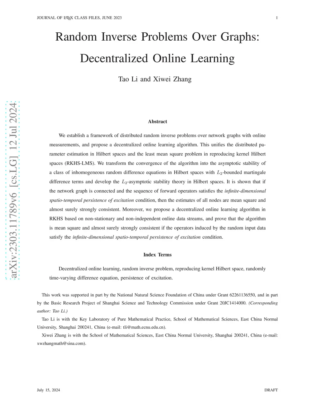 We establish a framework of distributed random inverse problems over network graphs with online measurements, and propose a decentralized online learning algorithm. This unifies the distributed parameter estimation in Hilbert spaces and the least mean square problem in reproducing kernel Hilbert spaces (RKHS-LMS). We transform the convergence of the algorithm into the asymptotic stability of a class of inhomogeneous random difference equations in Hilbert spaces with L2-bounded martingale difference terms and develop the L2 -asymptotic stability theory in Hilbert spaces. It is shown that if the network graph is connected and the sequence of forward operators satisfies the infinite-dimensional spatio-temporal persistence of excitation condition, then the estimates of all nodes are mean square and almost surely strongly consistent. Moreover, we propose a decentralized online learning algorithm in RKHS based on non-stationary and non-independent online data streams, and prove that the algorithm is mean square and almost surely strongly consistent if the operators induced by the random input data satisfy the infinite-dimensional spatio-temporal persistence of excitation condition.