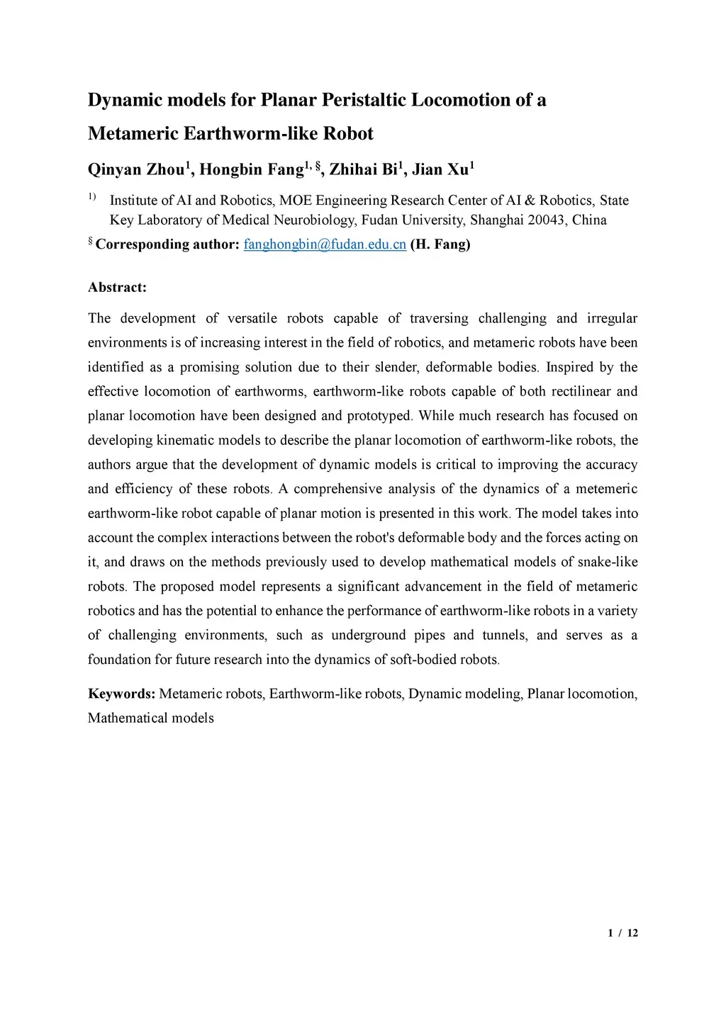 The development of versatile robots capable of traversing challenging and irregular environments is of increasing interest in the field of robotics, and metameric robots have been identified as a promising solution due to their slender, deformable bodies. Inspired by the effective locomotion of earthworms, earthworm-like robots capable of both rectilinear and planar locomotion have been designed and prototyped. While much research has focused on developing kinematic models to describe the planar locomotion of earthworm-like robots, the authors argue that the development of dynamic models is critical to improving the accuracy and efficiency of these robots. A comprehensive analysis of the dynamics of a metameric earthworm-like robot capable of planar motion is presented in this work. The model takes into account the complex interactions between the robot's deformable body and the forces acting on it and draws on the methods previously used to develop mathematical models of snake-like robots. The proposed model represents a significant advancement in the field of metameric robotics and has the potential to enhance the performance of earthworm-like robots in a variety of challenging environments, such as underground pipes and tunnels, and serves as a foundation for future research into the dynamics of soft-bodied robots.