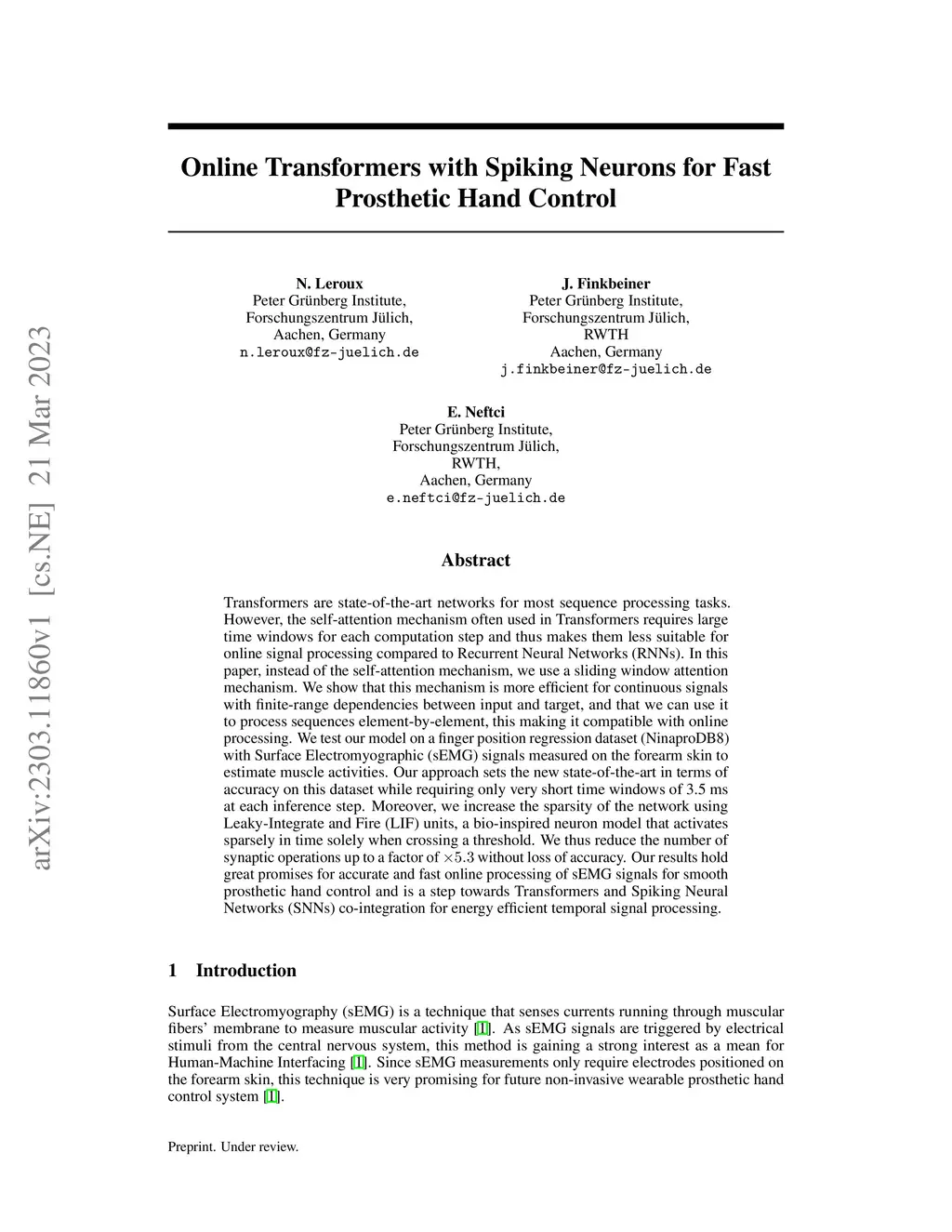 Transformers are state-of-the-art networks for most sequence processing tasks. However, the self-attention mechanism often used in Transformers requires large time windows for each computation step and thus makes them less suitable for online signal processing compared to Recurrent Neural Networks (RNNs). In this paper, instead of the self-attention mechanism, we use a sliding window attention mechanism. We show that this mechanism is more efficient for continuous signals with finite-range dependencies between input and target, and that we can use it to process sequences element-by-element, this making it compatible with online processing. We test our model on a finger position regression dataset (NinaproDB8) with Surface Electromyographic (sEMG) signals measured on the forearm skin to estimate muscle activities. Our approach sets the new state-of-the-art in terms of accuracy on this dataset while requiring only very short time windows of 3.5 ms at each inference step. Moreover, we increase the sparsity of the network using Leaky-Integrate and Fire (LIF) units, a bio-inspired neuron model that activates sparsely in time solely when crossing a threshold. We thus reduce the number of synaptic operations up to a factor of without loss of accuracy. Our results hold great promises for accurate and fast online processing of sEMG signals for smooth prosthetic hand control and is a step towards Transformers and Spiking Neural Networks (SNNs) co-integration for energy efficient temporal signal processing.