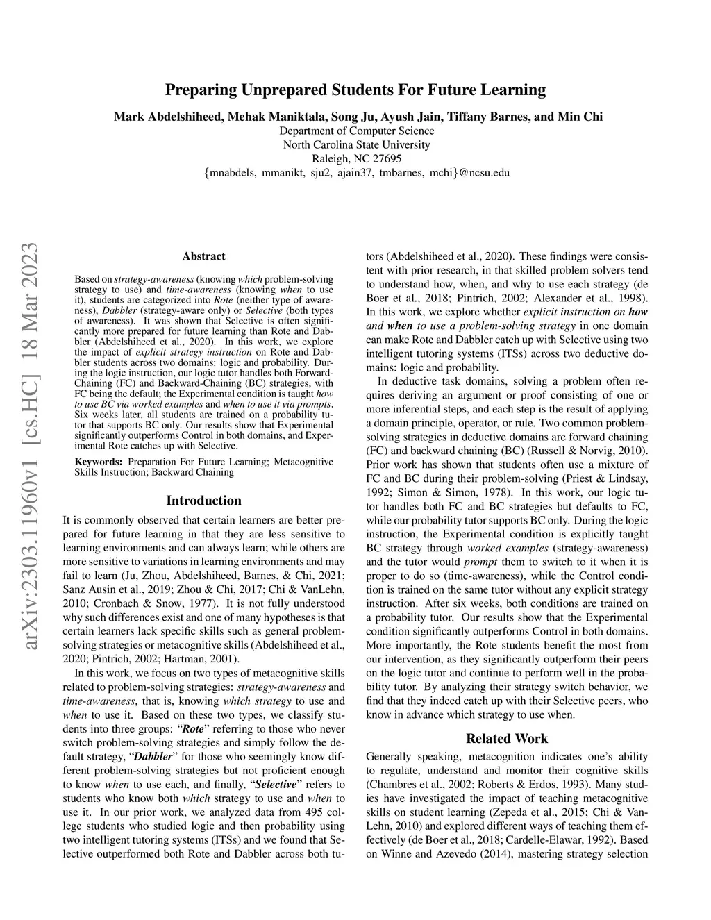 Based on strategy-awareness (knowing which problem-solving strategy to use) and time-awareness (knowing when to use it), students are categorized into Rote (neither type of awareness), Dabbler (strategy-aware only) or Selective (both types of awareness). It was shown that Selective is often significantly more prepared for future learning than Rote and Dabbler (Abdelshiheed et al., 2020). In this work, we explore the impact of explicit strategy instruction on Rote and Dabbler students across two domains: logic and probability. During the logic instruction, our logic tutor handles both Forward-Chaining (FC) and Backward-Chaining (BC) strategies, with FC being the default; the Experimental condition is taught how to use BC via worked examples and when to use it via prompts. Six weeks later, all students are trained on a probability tutor that supports BC only. Our results show that Experimental significantly outperforms Control in both domains, and Experimental Rote catches up with Selective.
