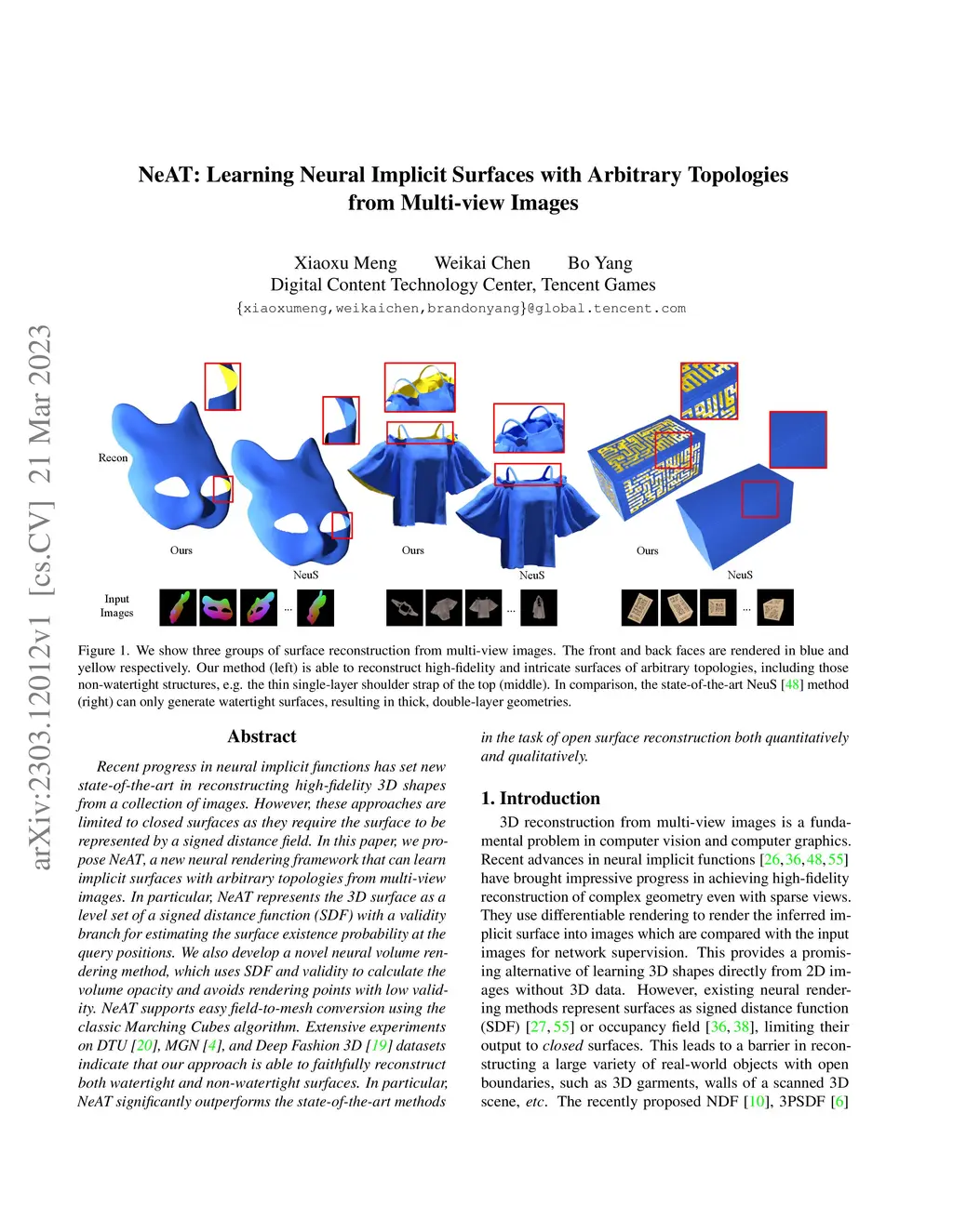 Recent progress in neural implicit functions has set new state-of-the-art in reconstructing high-fidelity 3D shapes from a collection of images. However, these approaches are limited to closed surfaces as they require the surface to be represented by a signed distance field. In this paper, we propose NeAT, a new neural rendering framework that can learn implicit surfaces with arbitrary topologies from multi-view images. In particular, NeAT represents the 3D surface as a level set of a signed distance function (SDF) with a validity branch for estimating the surface existence probability at the query positions. We also develop a novel neural volume rendering method, which uses SDF and validity to calculate the volume opacity and avoids rendering points with low validity. NeAT supports easy field-to-mesh conversion using the classic Marching Cubes algorithm. Extensive experiments on DTU, MGN, and Deep Fashion 3D datasets indicate that our approach is able to faithfully reconstruct both watertight and non-watertight surfaces. In particular, NeAT significantly outperforms the state-of-the-art methods in the task of open surface reconstruction both quantitatively and qualitatively.