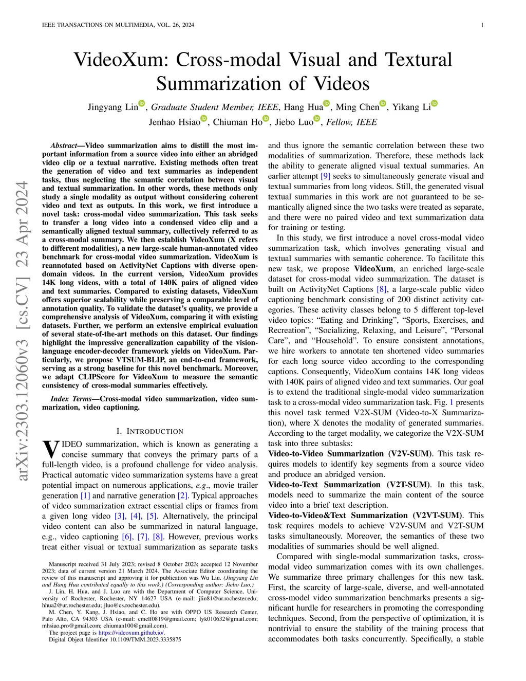 VideoXum: Cross-modal Visual and Textural Summarization of Videos