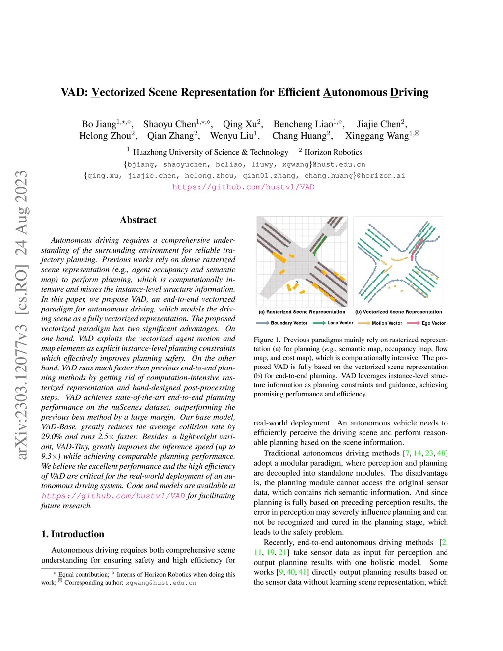 Autonomous driving requires a comprehensive understanding of the surrounding environment for reliable trajectory planning. Previous works rely on dense rasterized scene representation (e.g., agent occupancy and semantic map) to perform planning, which is computationally intensive and misses the instance-level structure information. In this paper, we propose VAD, an end-to-end vectorized paradigm for autonomous driving, which models the driving scene as a fully vectorized representation. The proposed vectorized paradigm has two significant advantages. On one hand, VAD exploits the vectorized agent motion and map elements as explicit instance-level planning constraints which effectively improves planning safety. On the other hand, VAD runs much faster than previous end-to-end planning methods by getting rid of computation-intensive rasterized representation and hand-designed post-processing steps. VAD achieves state-of-the-art end-to-end planning performance on the nuScenes dataset, outperforming the previous best method by a large margin. Our base model, VAD-Base, greatly reduces the average collision rate by 29.0% and runs 2.5x faster. Besides, a lightweight variant, VAD-Tiny, greatly improves the inference speed (up to 9.3x) while achieving comparable planning performance. We believe the excellent performance and the high efficiency of VAD are critical for the real-world deployment of an autonomous driving system. Code and models are available at https://github.com/hustvl/VAD for facilitating future research.