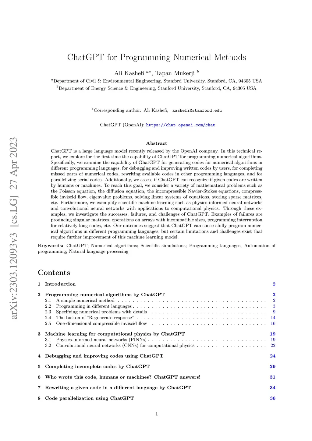 ChatGPT is a large language model recently released by the OpenAI company. In this technical report, we explore for the first time the capability of ChatGPT for programming numerical algorithms. Specifically, we examine the capability of GhatGPT for generating codes for numerical algorithms in different programming languages, for debugging and improving written codes by users, for completing missed parts of numerical codes, rewriting available codes in other programming languages, and for parallelizing serial codes. Additionally, we assess if ChatGPT can recognize if given codes are written by humans or machines. To reach this goal, we consider a variety of mathematical problems such as the Poisson equation, the diffusion equation, the incompressible Navier-Stokes equations, compressible inviscid flow, eigenvalue problems, solving linear systems of equations, storing sparse matrices, etc. Furthermore, we exemplify scientific machine learning such as physics-informed neural networks and convolutional neural networks with applications to computational physics. Through these examples, we investigate the successes, failures, and challenges of ChatGPT. Examples of failures are producing singular matrices, operations on arrays with incompatible sizes, programming interruption for relatively long codes, etc. Our outcomes suggest that ChatGPT can successfully program numerical algorithms in different programming languages, but certain limitations and challenges exist that require further improvement of this machine learning model.