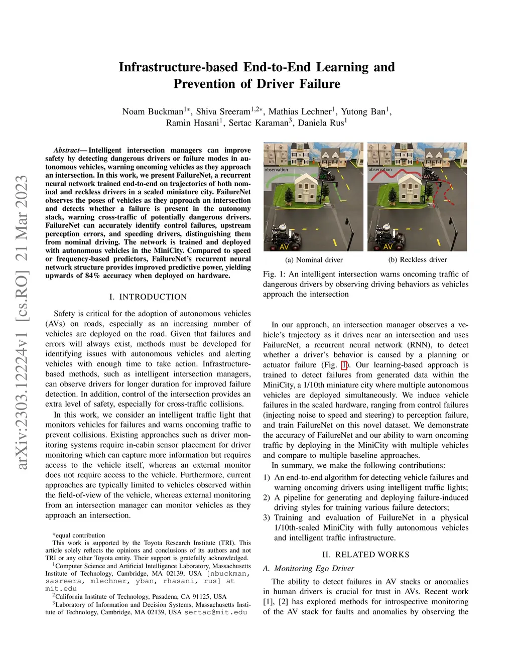 Intelligent intersection managers can improve safety by detecting dangerous drivers or failure modes in autonomous vehicles, warning oncoming vehicles as they approach an intersection. In this work, we present FailureNet, a recurrent neural network trained end-to-end on trajectories of both nominal and reckless drivers in a scaled miniature city. FailureNet observes the poses of vehicles as they approach an intersection and detects whether a failure is present in the autonomy stack, warning cross-traffic of potentially dangerous drivers. FailureNet can accurately identify control failures, upstream perception errors, and speeding drivers, distinguishing them from nominal driving. The network is trained and deployed with autonomous vehicles in the MiniCity. Compared to speed or frequency-based predictors, FailureNet's recurrent neural network structure provides improved predictive power, yielding upwards of 84% accuracy when deployed on hardware.