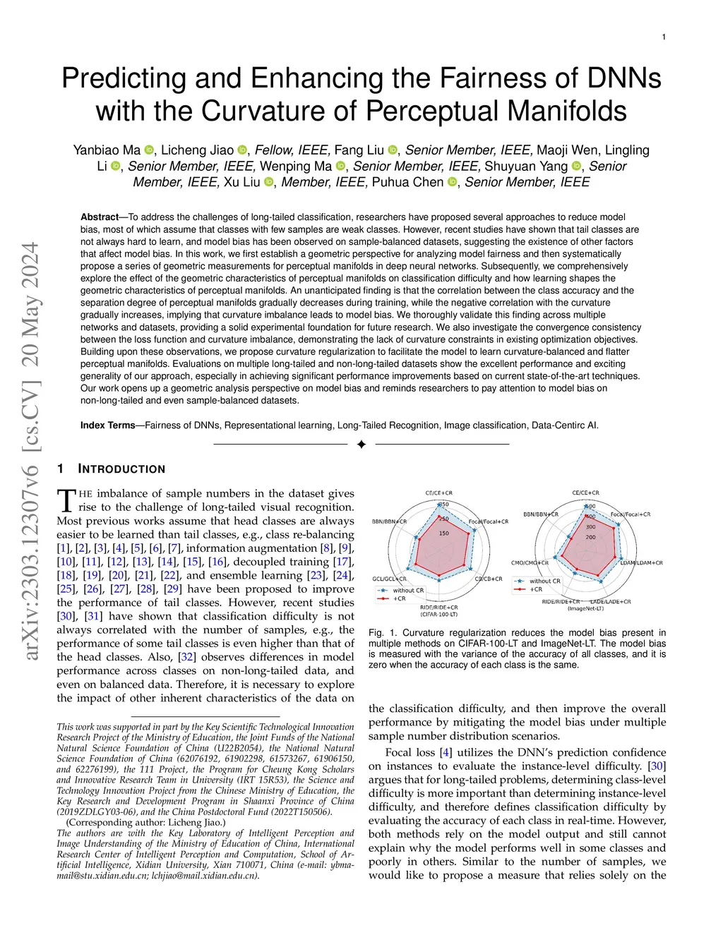 To address the challenges of long-tailed classification, researchers have proposed several approaches to reduce model bias, most of which assume that classes with few samples are weak classes. However, recent studies have shown that tail classes are not always hard to learn, and model bias has been observed on sample-balanced datasets, suggesting the existence of other factors that affect model bias. In this work, we first establish a geometric perspective for analyzing model fairness and then systematically propose a series of geometric measurements for perceptual manifolds in deep neural networks. Subsequently, we comprehensively explore the effect of the geometric characteristics of perceptual manifolds on classification difficulty and how learning shapes the geometric characteristics of perceptual manifolds. An unanticipated finding is that the correlation between the class accuracy and the separation degree of perceptual manifolds gradually decreases during training, while the negative correlation with the curvature gradually increases, implying that curvature imbalance leads to model bias.Building upon these observations, we propose curvature regularization to facilitate the model to learn curvature-balanced and flatter perceptual manifolds. Evaluations on multiple long-tailed and non-long-tailed datasets show the excellent performance and exciting generality of our approach, especially in achieving significant performance improvements based on current state-of-the-art techniques. Our work opens up a geometric analysis perspective on model bias and reminds researchers to pay attention to model bias on non-long-tailed and even sample-balanced datasets.