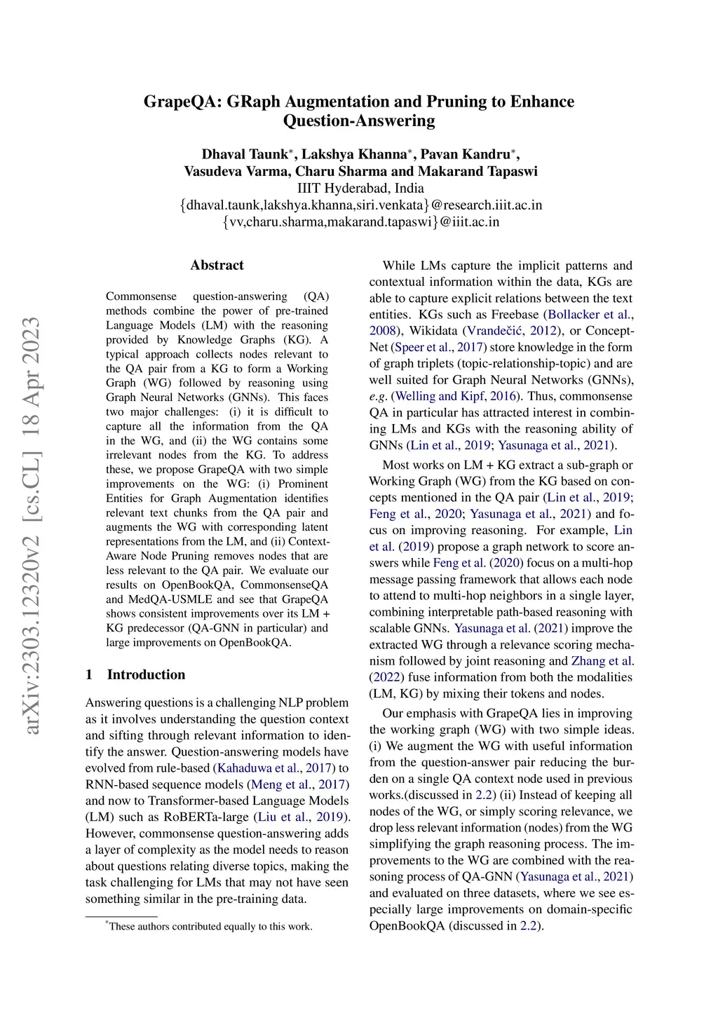 GrapeQA: GRaph Augmentation and Pruning to Enhance Question-Answering
