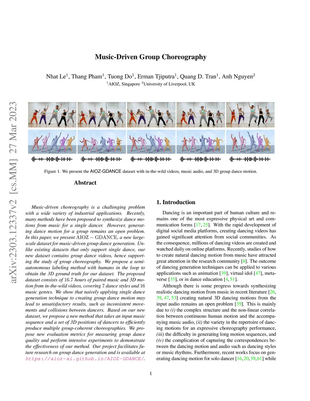 Music-driven choreography is a challenging problem with a wide variety of industrial applications. Recently, many methods have been proposed to synthesize dance motions from music for a single dancer. However, generating dance motion for a group remains an open problem. In this paper, we present , a new large-scale dataset for music-driven group dance generation. Unlike existing datasets that only support single dance, our new dataset contains group dance videos, hence supporting the study of group choreography. We propose a semi-autonomous labeling method with humans in the loop to obtain the 3D ground truth for our dataset. The proposed dataset consists of 16.7 hours of paired music and 3D motion from in-the-wild videos, covering 7 dance styles and 16 music genres. We show that naively applying single dance generation technique to creating group dance motion may lead to unsatisfactory results, such as inconsistent movements and collisions between dancers. Based on our new dataset, we propose a new method that takes an input music sequence and a set of 3D positions of dancers to efficiently produce multiple group-coherent choreographies. We propose new evaluation metrics for measuring group dance quality and perform intensive experiments to demonstrate the effectiveness of our method. Our project facilitates future research on group dance generation and is available at: https://aioz-ai.github.io/AIOZ-GDANCE/