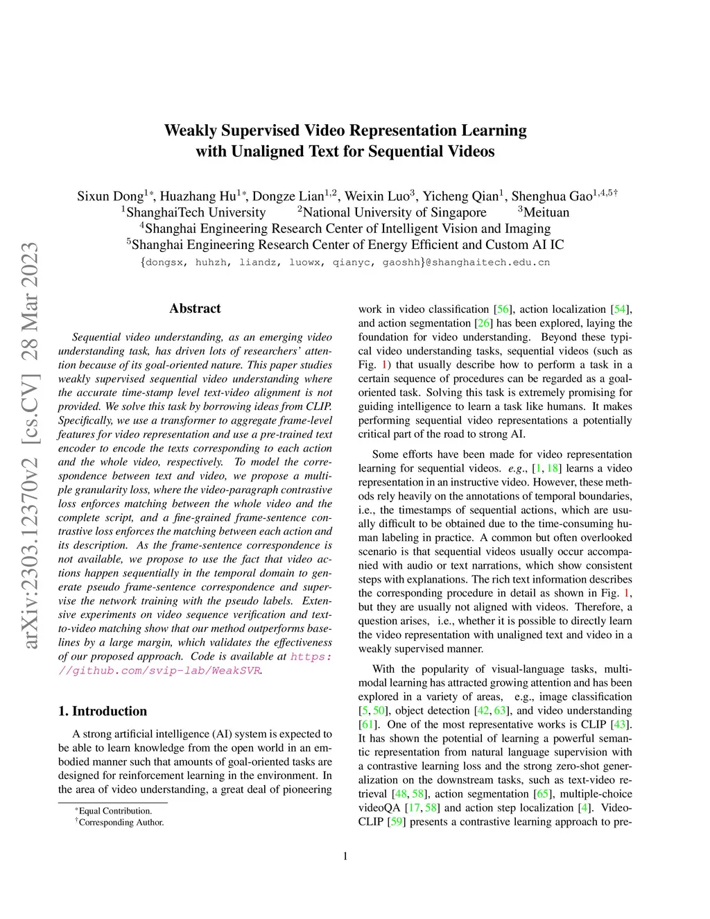 Sequential video understanding, as an emerging video understanding task, has driven lots of researchers' attention because of its goal-oriented nature. This paper studies weakly supervised sequential video understanding where the accurate time-stamp level text-video alignment is not provided. We solve this task by borrowing ideas from CLIP. Specifically, we use a transformer to aggregate frame-level features for video representation and use a pre-trained text encoder to encode the texts corresponding to each action and the whole video, respectively. To model the correspondence between text and video, we propose a multiple granularity loss, where the video-paragraph contrastive loss enforces matching between the whole video and the complete script, and a fine-grained frame-sentence contrastive loss enforces the matching between each action and its description. As the frame-sentence correspondence is not available, we propose to use the fact that video actions happen sequentially in the temporal domain to generate pseudo frame-sentence correspondence and supervise the network training with the pseudo labels. Extensive experiments on video sequence verification and text-to-video matching show that our method outperforms baselines by a large margin, which validates the effectiveness of our proposed approach. Code is available at https://github.com/svip-lab/WeakSVR