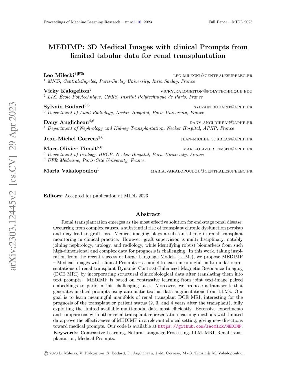 Renal transplantation emerges as the most effective solution for end-stage renal disease. Occurring from complex causes, a substantial risk of transplant chronic dysfunction persists and may lead to graft loss. Medical imaging plays a substantial role in renal transplant monitoring in clinical practice. However, graft supervision is multi-disciplinary, notably joining nephrology, urology, and radiology, while identifying robust biomarkers from such high-dimensional and complex data for prognosis is challenging. In this work, taking inspiration from the recent success of Large Language Models (LLMs), we propose MEDIMP -- Medical Images with clinical Prompts -- a model to learn meaningful multi-modal representations of renal transplant Dynamic Contrast-Enhanced Magnetic Resonance Imaging (DCE MRI) by incorporating structural clinicobiological data after translating them into text prompts. MEDIMP is based on contrastive learning from joint text-image paired embeddings to perform this challenging task. Moreover, we propose a framework that generates medical prompts using automatic textual data augmentations from LLMs. Our goal is to learn meaningful manifolds of renal transplant DCE MRI, interesting for the prognosis of the transplant or patient status (2, 3, and 4 years after the transplant), fully exploiting the limited available multi-modal data most efficiently. Extensive experiments and comparisons with other renal transplant representation learning methods with limited data prove the effectiveness of MEDIMP in a relevant clinical setting, giving new directions toward medical prompts. Our code is available at https://github.com/leomlck/MEDIMP.