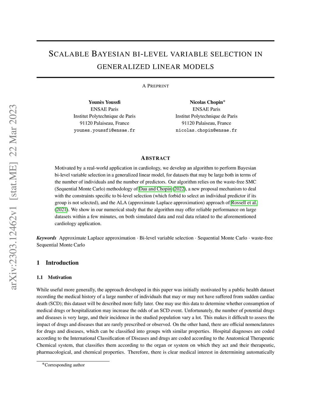 Motivated by a real-world application in cardiology, we develop an algorithm to perform Bayesian bi-level variable selection in a generalized linear model, for datasets that may be large both in terms of the number of individuals and the number of predictors. Our algorithm relies on the waste-free SMC Sequential Monte Carlo methodology of Dau and Chopin (2022), a new proposal mechanism to deal with the constraints specific to bi-level selection (which forbid to select an individual predictor if its group is not selected), and the ALA (approximate Laplace approximation) approach of Rossell et al. (2021). We show in our numerical study that the algorithm may offer reliable performance on large datasets within a few minutes, on both simulated data and real data related to the aforementioned cardiology application.