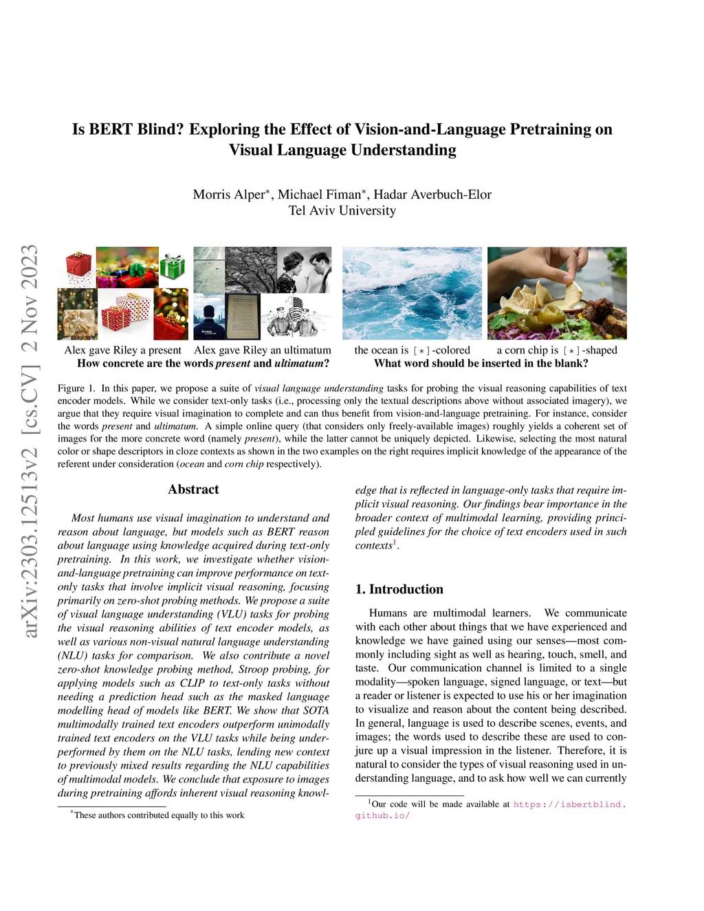 Most humans use visual imagination to understand and reason about language, but models such as BERT reason about language using knowledge acquired during text-only pretraining. In this work, we investigate whether vision-and-language pretraining can improve performance on text-only tasks that involve implicit visual reasoning, focusing primarily on zero-shot probing methods. We propose a suite of visual language understanding (VLU) tasks for probing the visual reasoning abilities of text encoder models, as well as various non-visual natural language understanding (NLU) tasks for comparison. We also contribute a novel zero-shot knowledge probing method, Stroop probing, for applying models such as CLIP to text-only tasks without needing a prediction head such as the masked language modelling head of models like BERT. We show that SOTA multimodally trained text encoders outperform unimodally trained text encoders on the VLU tasks while being underperformed by them on the NLU tasks, lending new context to previously mixed results regarding the NLU capabilities of multimodal models. We conclude that exposure to images during pretraining affords inherent visual reasoning knowledge that is reflected in language-only tasks that require implicit visual reasoning. Our findings bear importance in the broader context of multimodal learning, providing principled guidelines for the choice of text encoders used in such contexts.