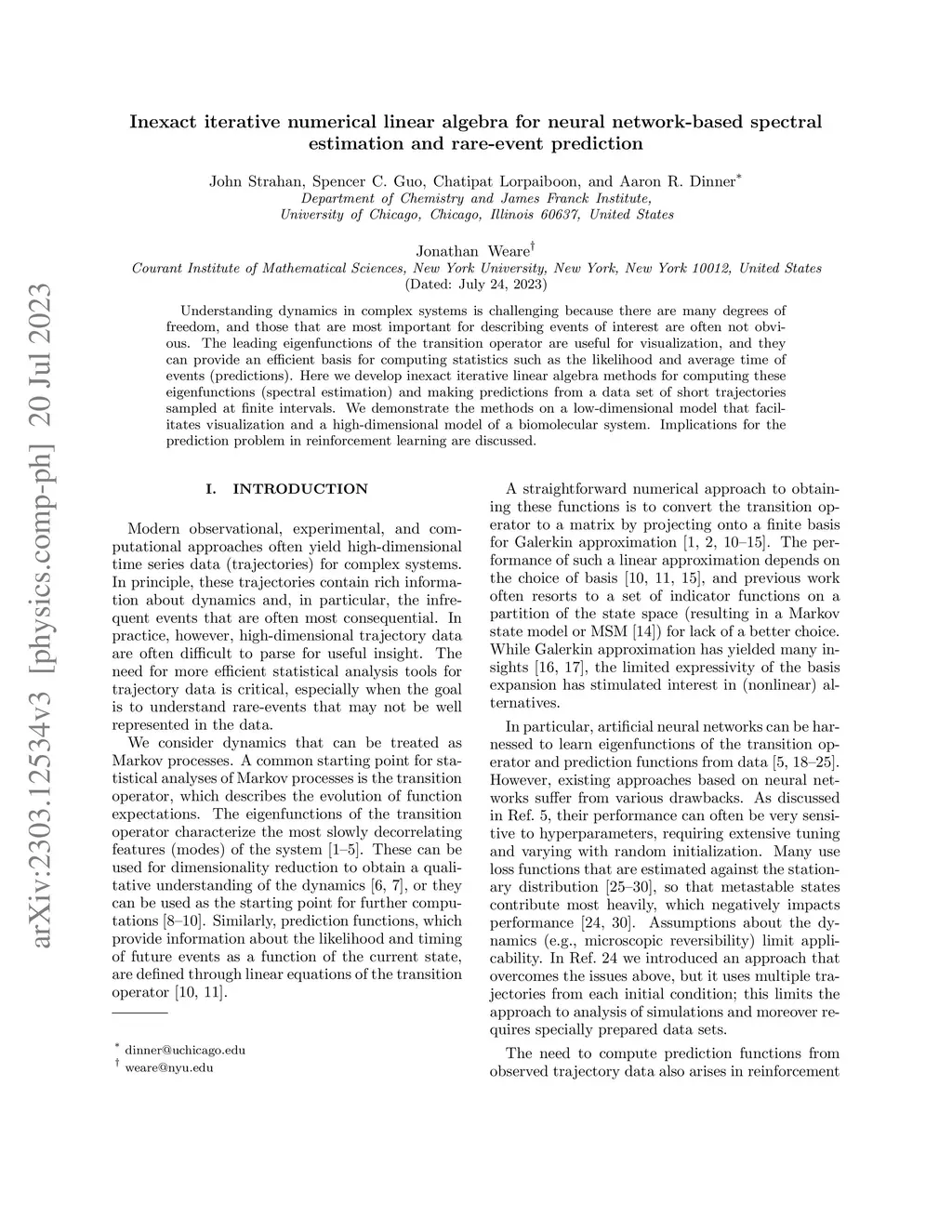 Understanding dynamics in complex systems is challenging because there are many degrees of freedom, and those that are most important for describing events of interest are often not obvious. The leading eigenfunctions of the transition operator are useful for visualization, and they can provide an efficient basis for computing statistics such as the likelihood and average time of events (predictions). Here we develop inexact iterative linear algebra methods for computing these eigenfunctions (spectral estimation) and making predictions from a data set of short trajectories sampled at finite intervals. We demonstrate the methods on a low-dimensional model that facilitates visualization and a high-dimensional model of a biomolecular system. Implications for the prediction problem in reinforcement learning are discussed.