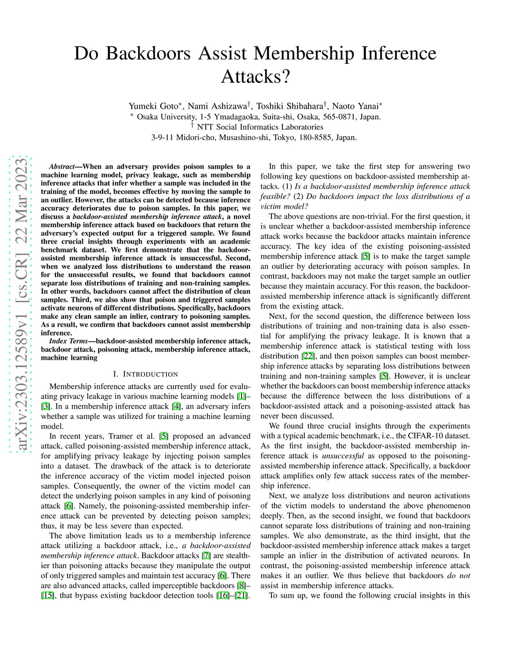 When an adversary provides poison samples to a machine learning model, privacy leakage, such as membership inference attacks that infer whether a sample was included in the training of the model, becomes effective by moving the sample to an outlier. However, the attacks can be detected because inference accuracy deteriorates due to poison samples. In this paper, we discuss a \textit{backdoor-assisted membership inference attack}, a novel membership inference attack based on backdoors that return the adversary's expected output for a triggered sample. We found three crucial insights through experiments with an academic benchmark dataset. We first demonstrate that the backdoor-assisted membership inference attack is unsuccessful. Second, when we analyzed loss distributions to understand the reason for the unsuccessful results, we found that backdoors cannot separate loss distributions of training and non-training samples. In other words, backdoors cannot affect the distribution of clean samples. Third, we also show that poison and triggered samples activate neurons of different distributions. Specifically, backdoors make any clean sample an inlier, contrary to poisoning samples. As a result, we confirm that backdoors cannot assist membership inference.