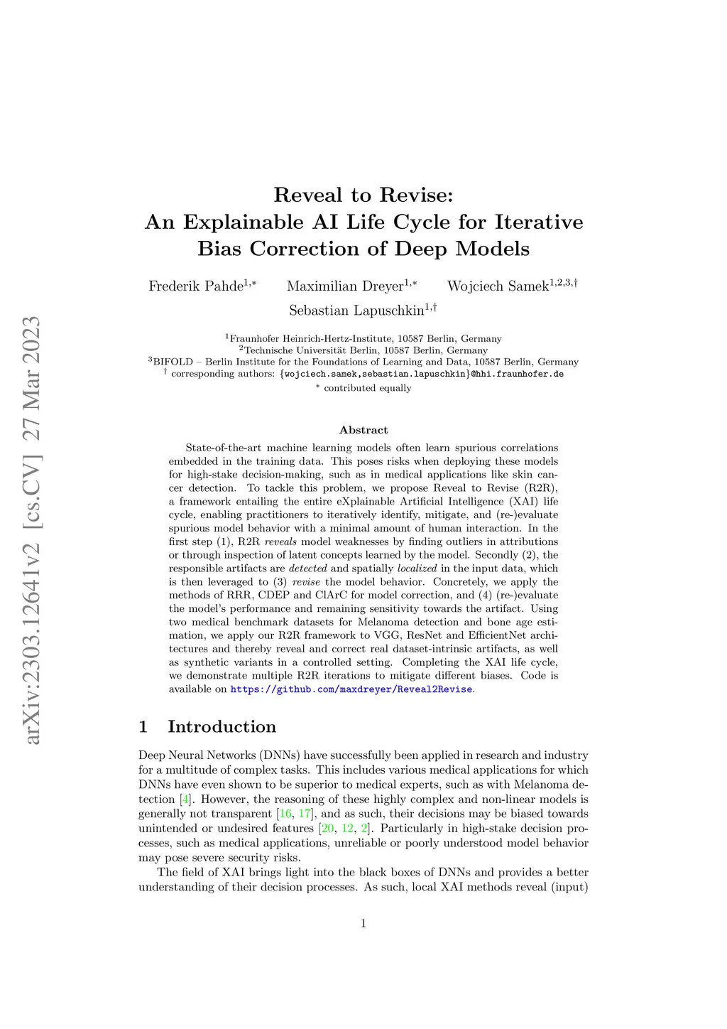 State-of-the-art machine learning models often learn spurious correlations embedded in the training data. This poses risks when deploying these models for high-stake decision-making, such as in medical applications like skin cancer detection. To tackle this problem, we propose Reveal to Revise (R2R), a framework entailing the entire eXplainable Artificial Intelligence (XAI) life cycle, enabling practitioners to iteratively identify, mitigate, and (re-)evaluate spurious model behavior with a minimal amount of human interaction. In the first step (1), R2R reveals model weaknesses by finding outliers in attributions or through inspection of latent concepts learned by the model. Secondly (2), the responsible artifacts are detected and spatially localized in the input data, which is then leveraged to (3) revise the model behavior. Concretely, we apply the methods of RRR, CDEP and ClArC for model correction, and (4) (re-)evaluate the model's performance and remaining sensitivity towards the artifact. Using two medical benchmark datasets for Melanoma detection and bone age estimation, we apply our R2R framework to VGG, ResNet and EfficientNet architectures and thereby reveal and correct real dataset-intrinsic artifacts, as well as synthetic variants in a controlled setting. Completing the XAI life cycle, we demonstrate multiple R2R iterations to mitigate different biases. Code is available on https://github.com/maxdreyer/Reveal2Revise.