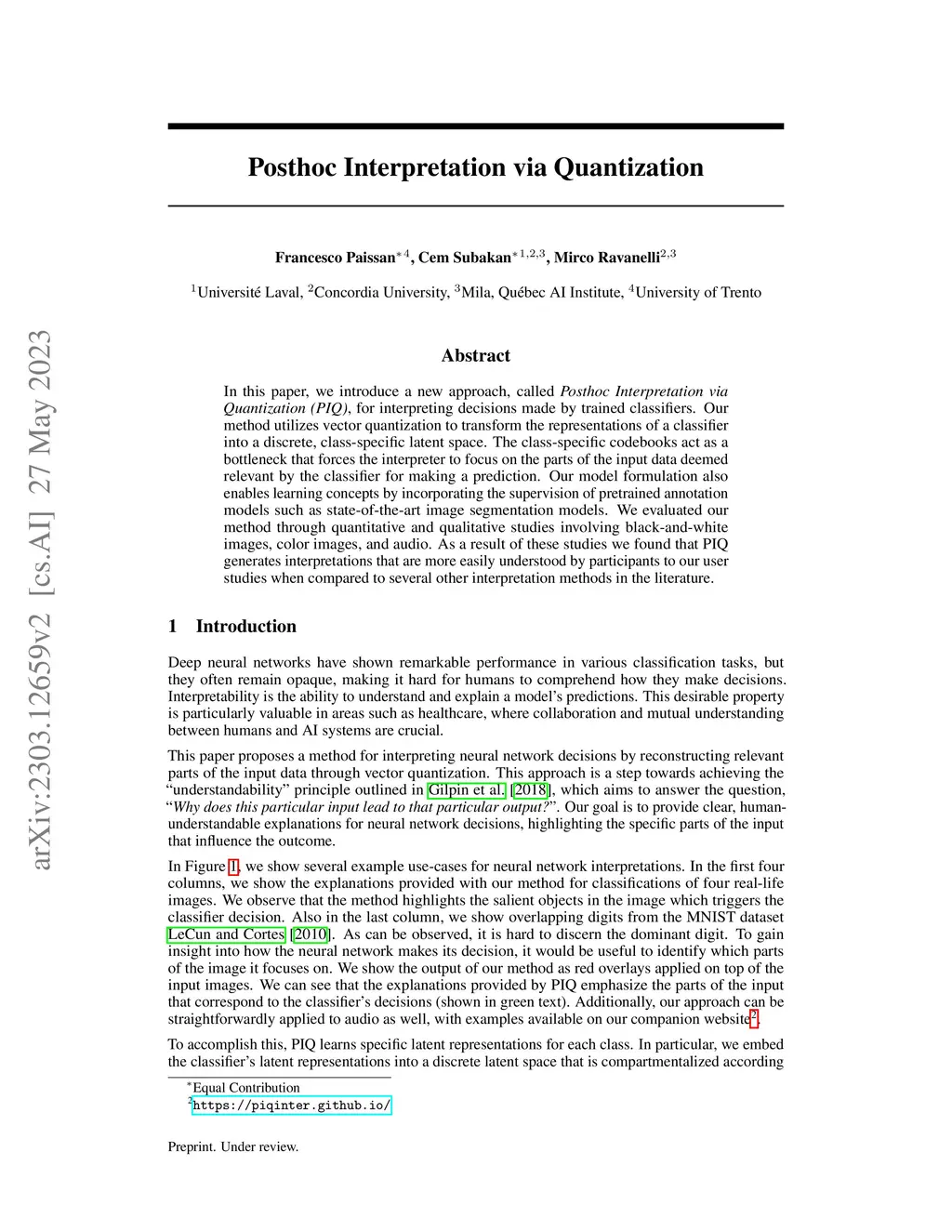In this paper, we introduce a new approach, called "Posthoc Interpretation via Quantization (PIQ)", for interpreting decisions made by trained classifiers. Our method utilizes vector quantization to transform the representations of a classifier into a discrete, class-specific latent space. The class-specific codebooks act as a bottleneck that forces the interpreter to focus on the parts of the input data deemed relevant by the classifier for making a prediction. We evaluated our method through quantitative and qualitative studies and found that PIQ generates interpretations that are more easily understood by participants to our user studies when compared to several other interpretation methods in the literature.