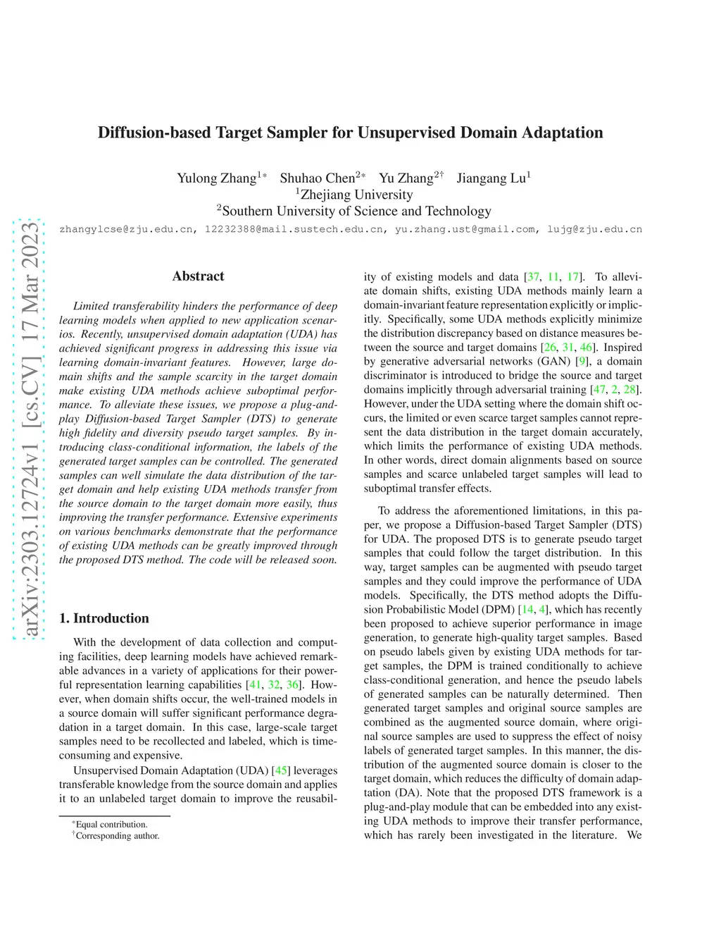 Limited transferability hinders the performance of deep learning models when applied to new application scenarios. Recently, unsupervised domain adaptation (UDA) has achieved significant progress in addressing this issue via learning domain-invariant features. However, large domain shifts and the sample scarcity in the target domain make existing UDA methods achieve suboptimal performance. To alleviate these issues, we propose a plug-and-play Diffusion-based Target Sampler (DTS) to generate high fidelity and diversity pseudo target samples. By introducing class-conditional information, the labels of the generated target samples can be controlled. The generated samples can well simulate the data distribution of the target domain and help existing UDA methods transfer from the source domain to the target domain more easily, thus improving the transfer performance. Extensive experiments on various benchmarks demonstrate that the performance of existing UDA methods can be greatly improved through the proposed DTS method.