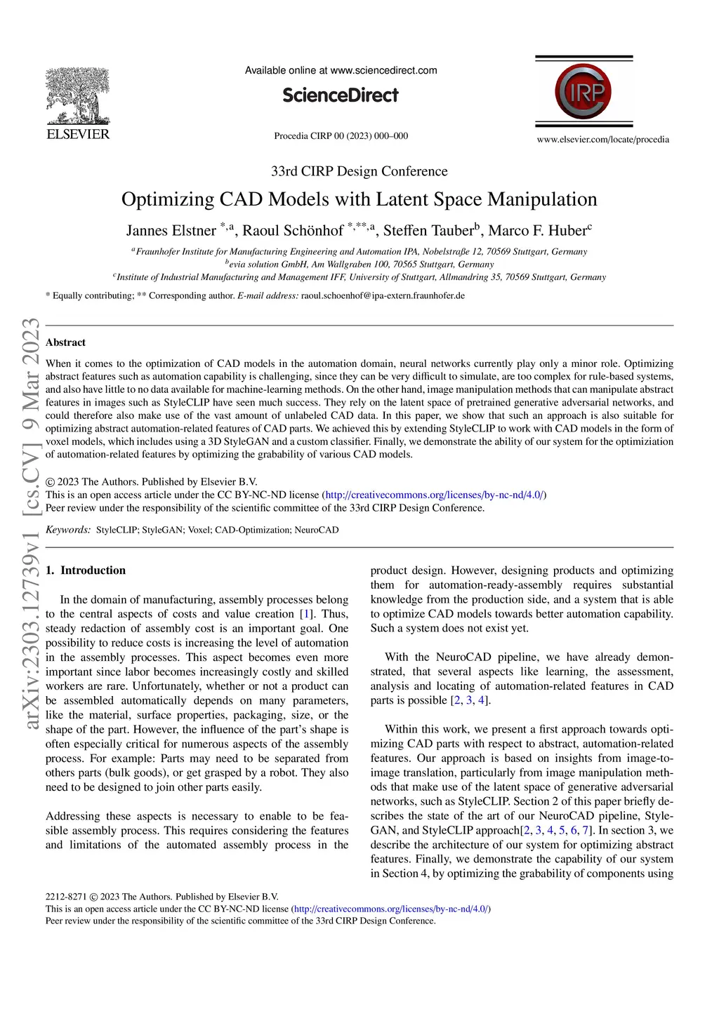 When it comes to the optimization of CAD models in the automation domain, neural networks currently play only a minor role. Optimizing abstract features such as automation capability is challenging, since they can be very difficult to simulate, are too complex for rule-based systems, and also have little to no data available for machine-learning methods. On the other hand, image manipulation methods that can manipulate abstract features in images such as StyleCLIP have seen much success. They rely on the latent space of pretrained generative adversarial networks, and could therefore also make use of the vast amount of unlabeled CAD data. In this paper, we show that such an approach is also suitable for optimizing abstract automation-related features of CAD parts. We achieved this by extending StyleCLIP to work with CAD models in the form of voxel models, which includes using a 3D StyleGAN and a custom classifier. Finally, we demonstrate the ability of our system for the optimiziation of automation-related features by optimizing the grabability of various CAD models. This is an open access article under the CC BY-NC-ND license (http://creativecommons.org/licenses/by-nc-nd/4.0/) Peer review under the responsibility of the scientific committee of the 33rd CIRP Design Conference.