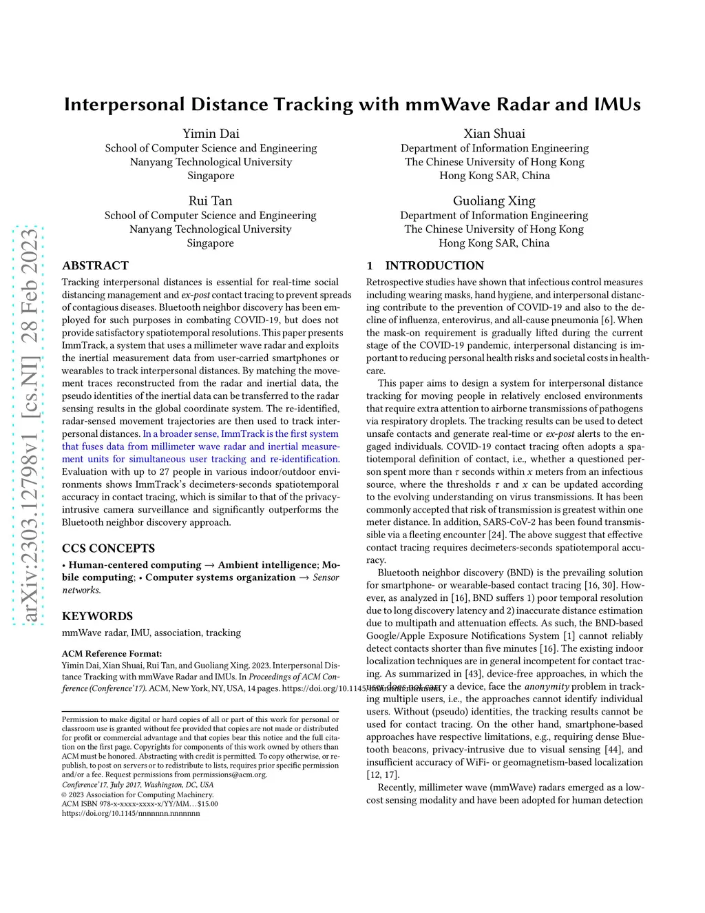 Tracking interpersonal distances is essential for real-time social distancing management and {\em ex-post} contact tracing to prevent spreads of contagious diseases. Bluetooth neighbor discovery has been employed for such purposes in combating COVID-19, but does not provide satisfactory spatiotemporal resolutions. This paper presents ImmTrack, a system that uses a millimeter wave radar and exploits the inertial measurement data from user-carried smartphones or wearables to track interpersonal distances. By matching the movement traces reconstructed from the radar and inertial data, the pseudo identities of the inertial data can be transferred to the radar sensing results in the global coordinate system. The re-identified, radar-sensed movement trajectories are then used to track interpersonal distances. In a broader sense, ImmTrack is the first system that fuses data from millimeter wave radar and inertial measurement units for simultaneous user tracking and re-identification. Evaluation with up to 27 people in various indoor/outdoor environments shows ImmTrack's decimeters-seconds spatiotemporal accuracy in contact tracing, which is similar to that of the privacy-intrusive camera surveillance and significantly outperforms the Bluetooth neighbor discovery approach.