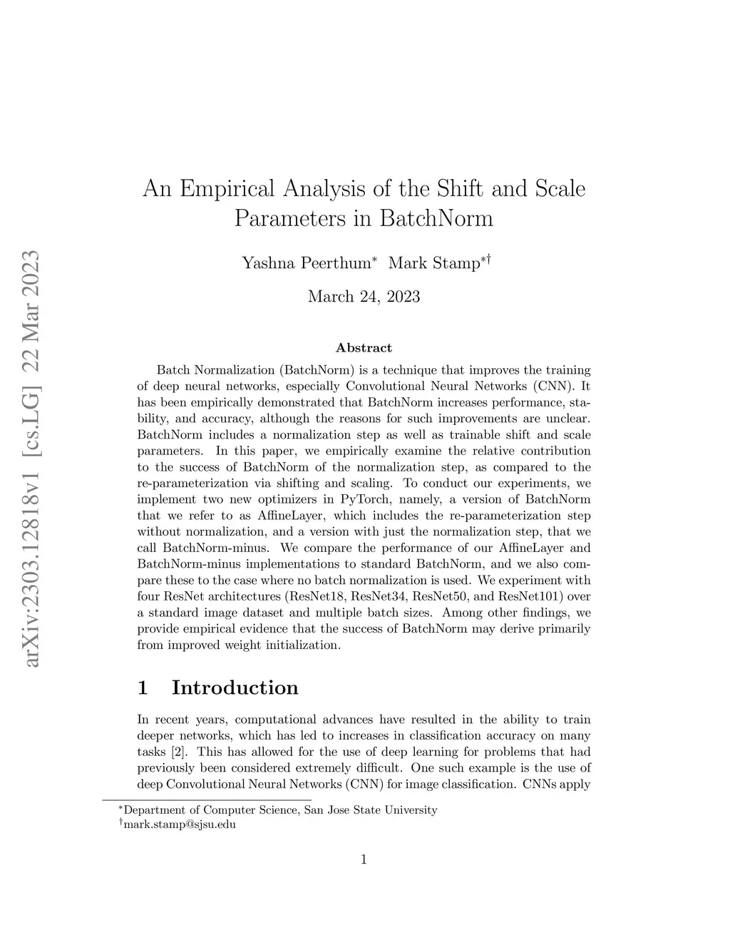 Batch Normalization (BatchNorm) is a technique that improves the training of deep neural networks, especially Convolutional Neural Networks (CNN). It has been empirically demonstrated that BatchNorm increases performance, stability, and accuracy, although the reasons for such improvements are unclear. BatchNorm includes a normalization step as well as trainable shift and scale parameters. In this paper, we empirically examine the relative contribution to the success of BatchNorm of the normalization step, as compared to the re-parameterization via shifting and scaling. To conduct our experiments, we implement two new optimizers in PyTorch, namely, a version of BatchNorm that we refer to as AffineLayer, which includes the re-parameterization step without normalization, and a version with just the normalization step, that we call BatchNorm-minus. We compare the performance of our AffineLayer and BatchNorm-minus implementations to standard BatchNorm, and we also compare these to the case where no batch normalization is used. We experiment with four ResNet architectures (ResNet18, ResNet34, ResNet50, and ResNet101) over a standard image dataset and multiple batch sizes. Among other findings, we provide empirical evidence that the success of BatchNorm may derive primarily from improved weight initialization.
