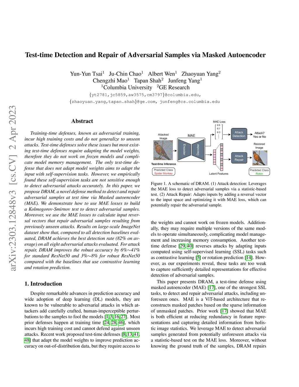 Training-time defenses, known as adversarial training, incur high training costs and do not generalize to unseen attacks. Test-time defenses solve these issues but most existing test-time defenses require adapting the model weights, therefore they do not work on frozen models and complicate model memory management. The only test-time defense that does not adapt model weights aims to adapt the input with self-supervision tasks. However, we empirically found these self-supervision tasks are not sensitive enough to detect adversarial attacks accurately. In this paper, we propose DRAM, a novel defense method to detect and repair adversarial samples at test time via Masked autoencoder (MAE). We demonstrate how to use MAE losses to build a Kolmogorov-Smirnov test to detect adversarial samples. Moreover, we use the MAE losses to calculate input reversal vectors that repair adversarial samples resulting from previously unseen attacks. Results on large-scale ImageNet dataset show that, compared to all detection baselines evaluated, DRAM achieves the best detection rate (82% on average) on all eight adversarial attacks evaluated. For attack repair, DRAM improves the robust accuracy by 6% ~ 41% for standard ResNet50 and 3% ~ 8% for robust ResNet50 compared with the baselines that use contrastive learning and rotation prediction.