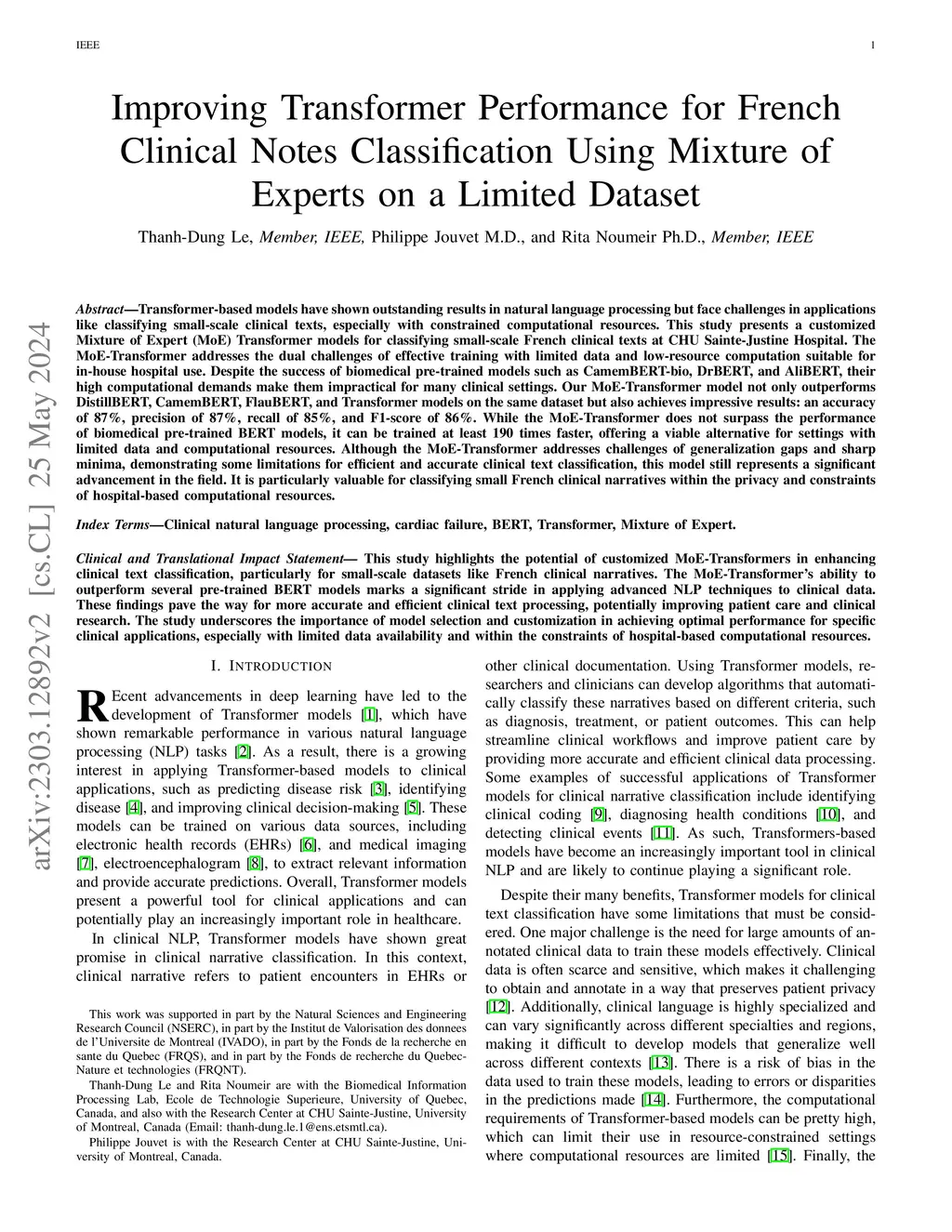 Improving Transformer Performance for French Clinical Notes Classification Using Mixture of Experts on a Limited Dataset